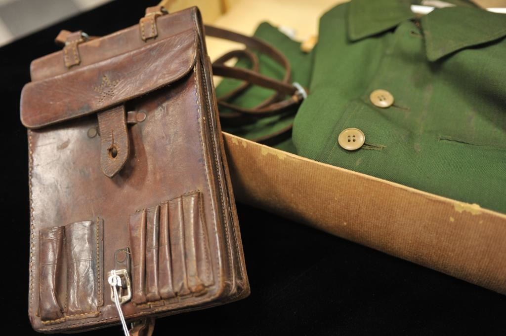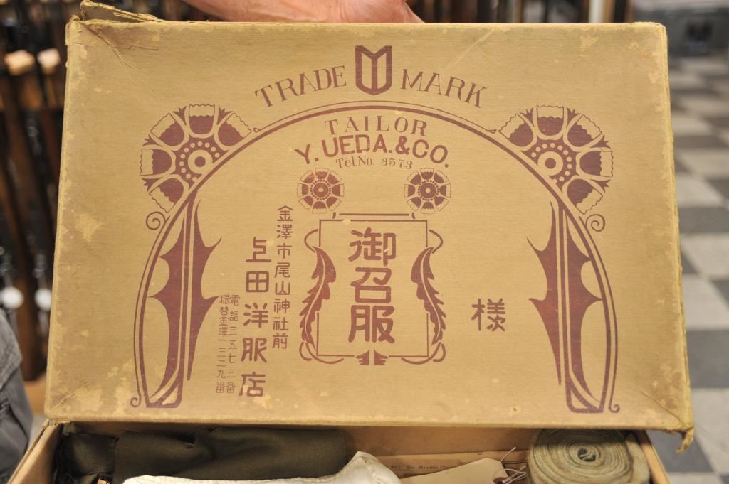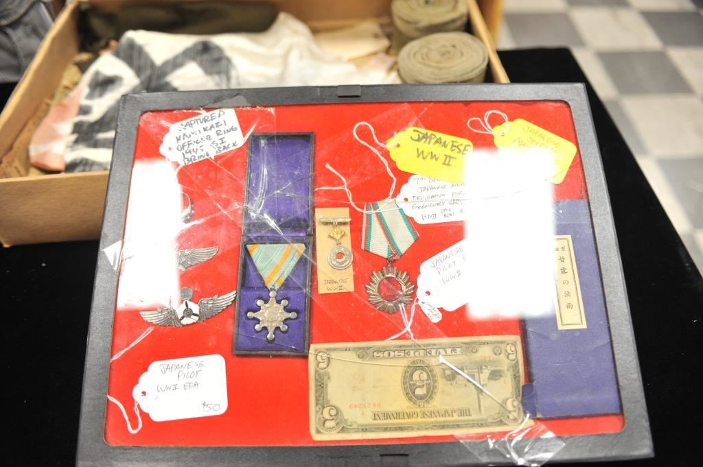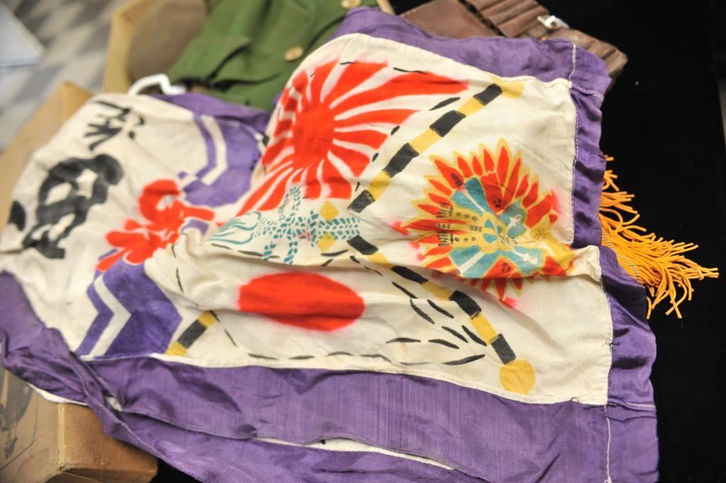 Japan WWII lot as described; Dispatch case, canteen, civil defense jacket, silk banner, medal, wings, kamikaze officer’s ring and misc. A good grouping. Est.: $200-$400
