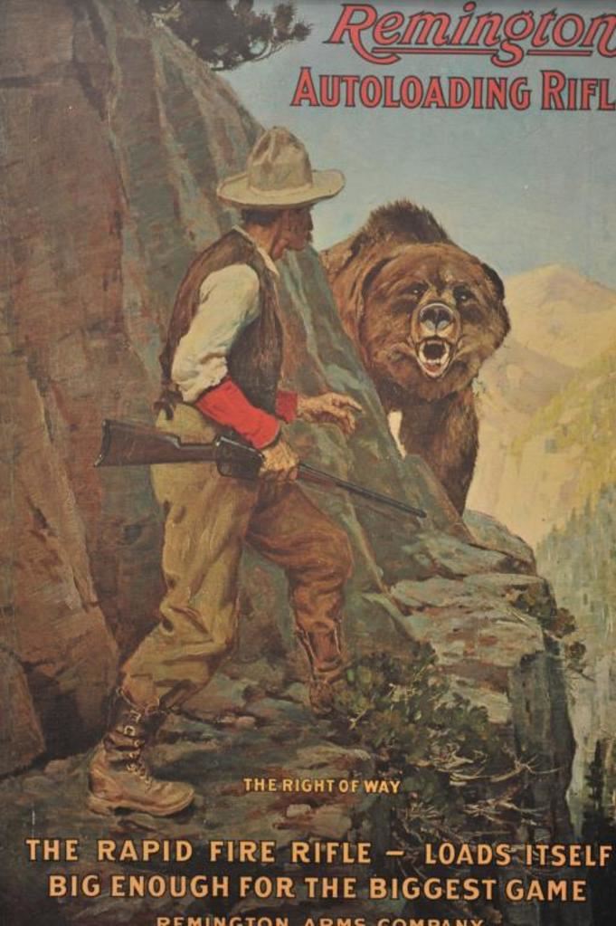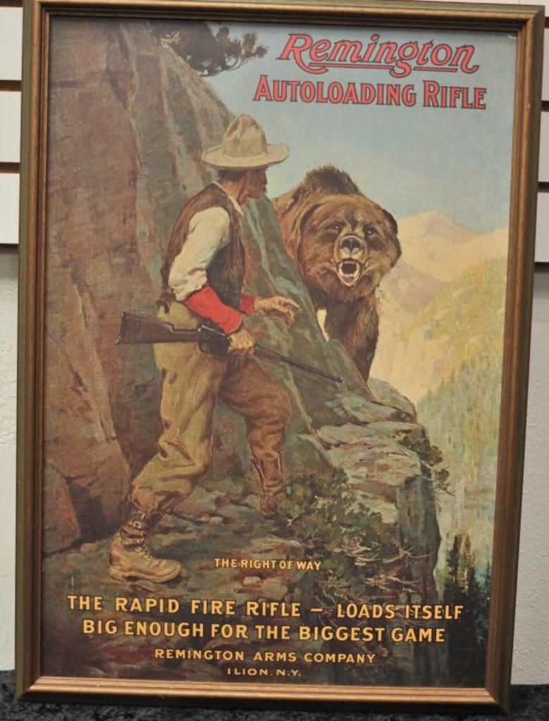 Modern reproduction of a Remington advertisement. A framed advertisement for the Remington auto loading rifle depicting a hunter and grizzly bear, titled, “The Right of Way”, it measures 19” by 26” with a green and gold wooden frame. The picture is in good condition with no damage and would benefit from a cleaning. A nice decorator piece for the gun room. $50-$100.