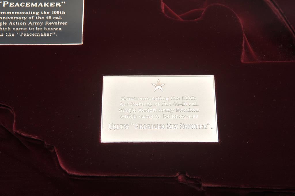 Colt commemorative display case for Peacemaker Centennial set with medallions. Near excellent. Est.: $150-$300