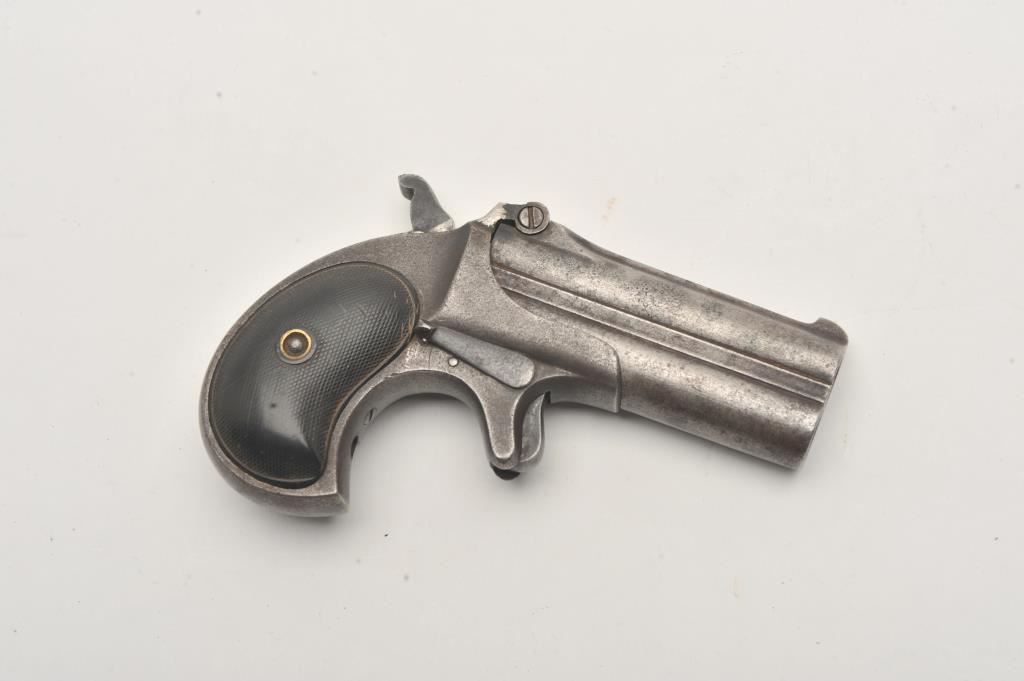 Remington O/U derringer, .41RF caliber, 3” barrels, grey patina to metal surfaces, checkered hard rubber grips, S/N 6; one line gap address, repaired hinge, working action, even patina to metal surfaces, worn but complete grips. (Antique). Est.: $200-$400.