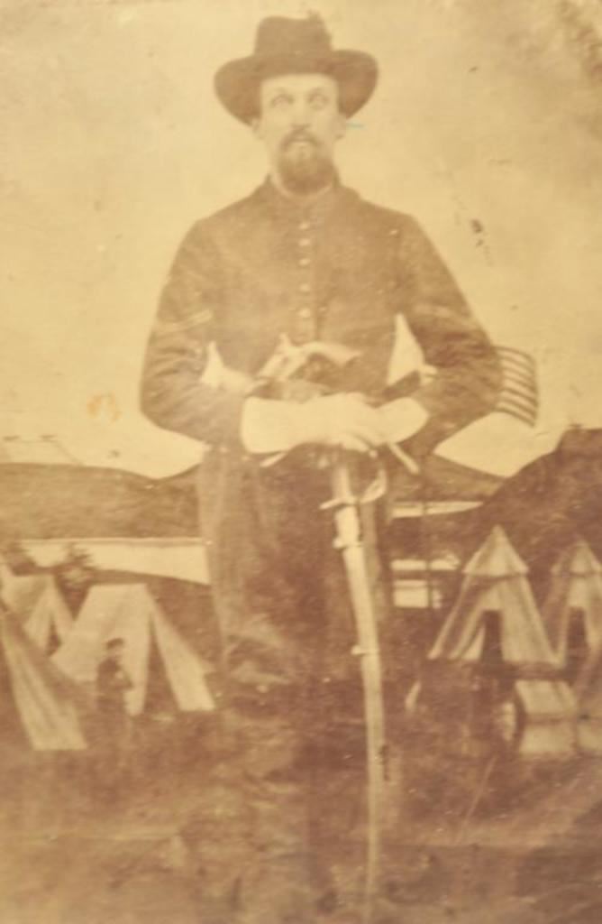 Large old carved wooden frame with sepia tone photo of a Union Civil War soldier in uniform with a cavalry saber and percussion revolver in his waistband with ID on back of frame “Herman H. Kreger/Co. C 16th Regt. PA Cav. Vol./in front of Petersburg VA”. Accompanied by copy of his National Archives Service and Pension records. Est.: $175-$350.
