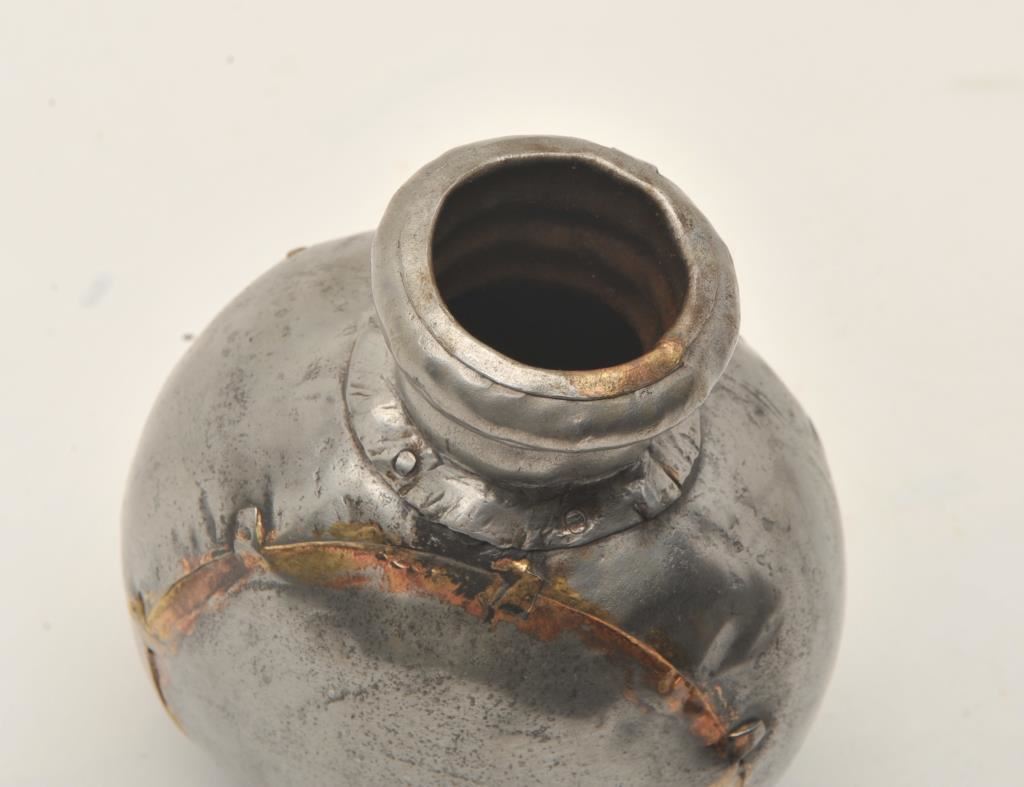 Unusual nineteenth Century small wide mouth tin drinking vessel, approximately 6” in height and 5” in diameter; scattered old dents and dings, side panels appear copper soldered; wooden stopper. Est.: $200-$400.