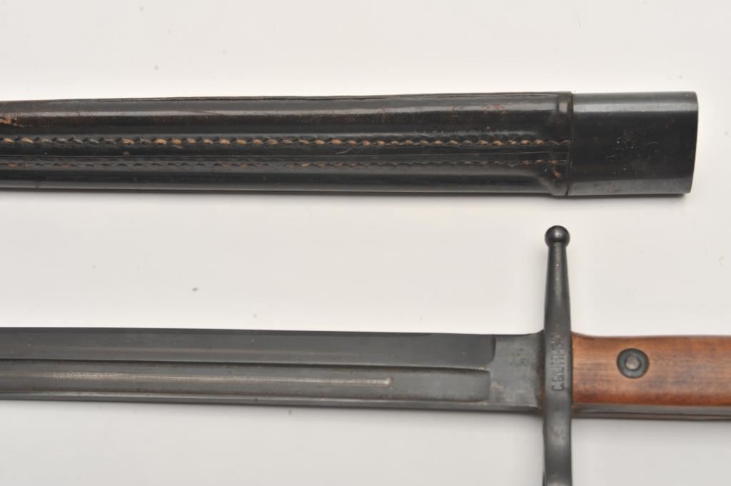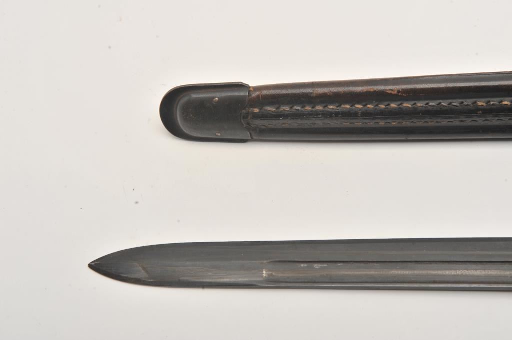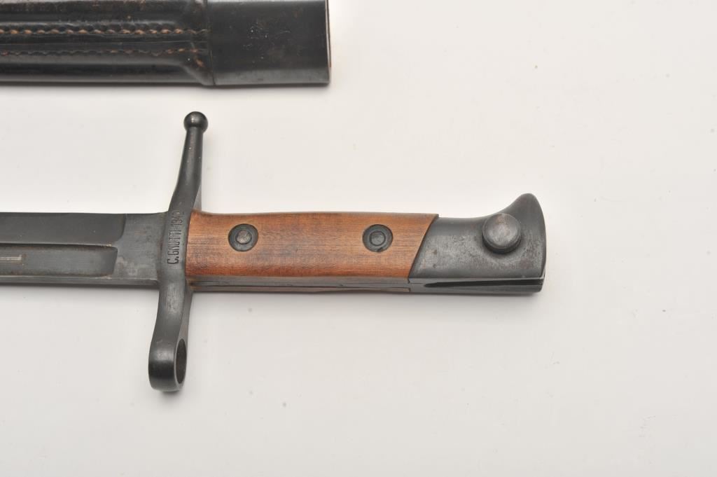 Italian bayonet marked, “C. GNUTTI” and dated 1942. The bayonet is in very good overall condition with a 12” blade and overall length of 16”. The blade has not been sharpened and retains significant original finish. The smooth wood handle is in good condition. The leather scabbard is also in good condition. Est.: $50-$100.