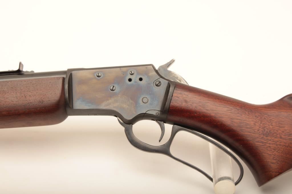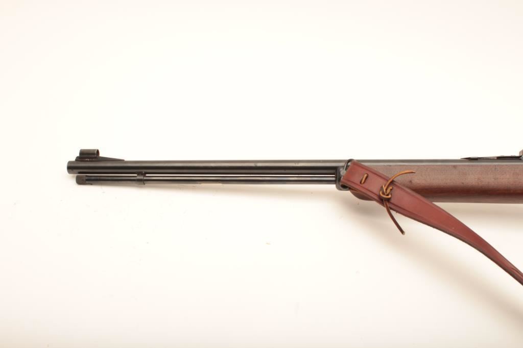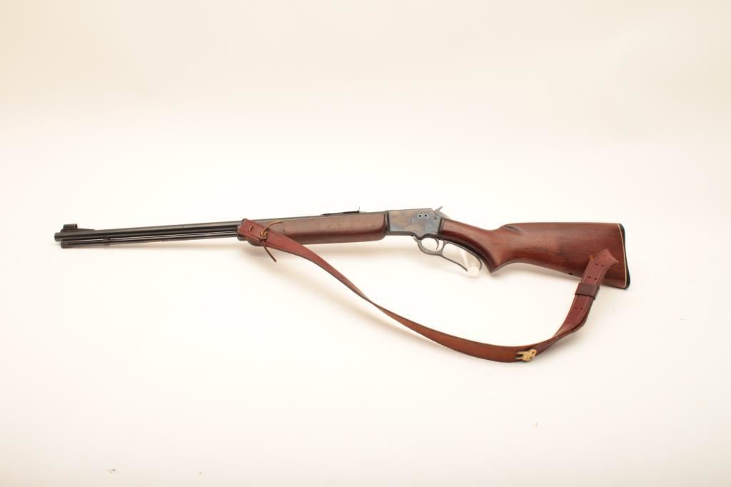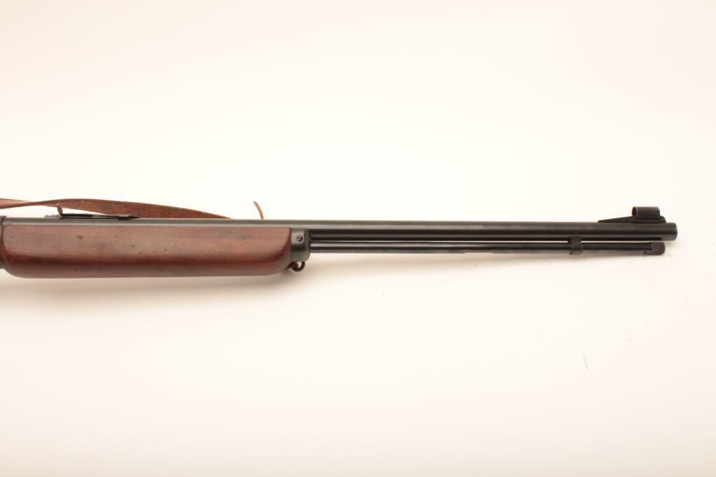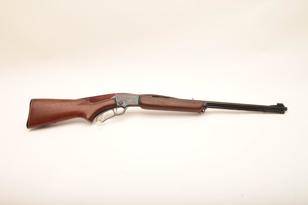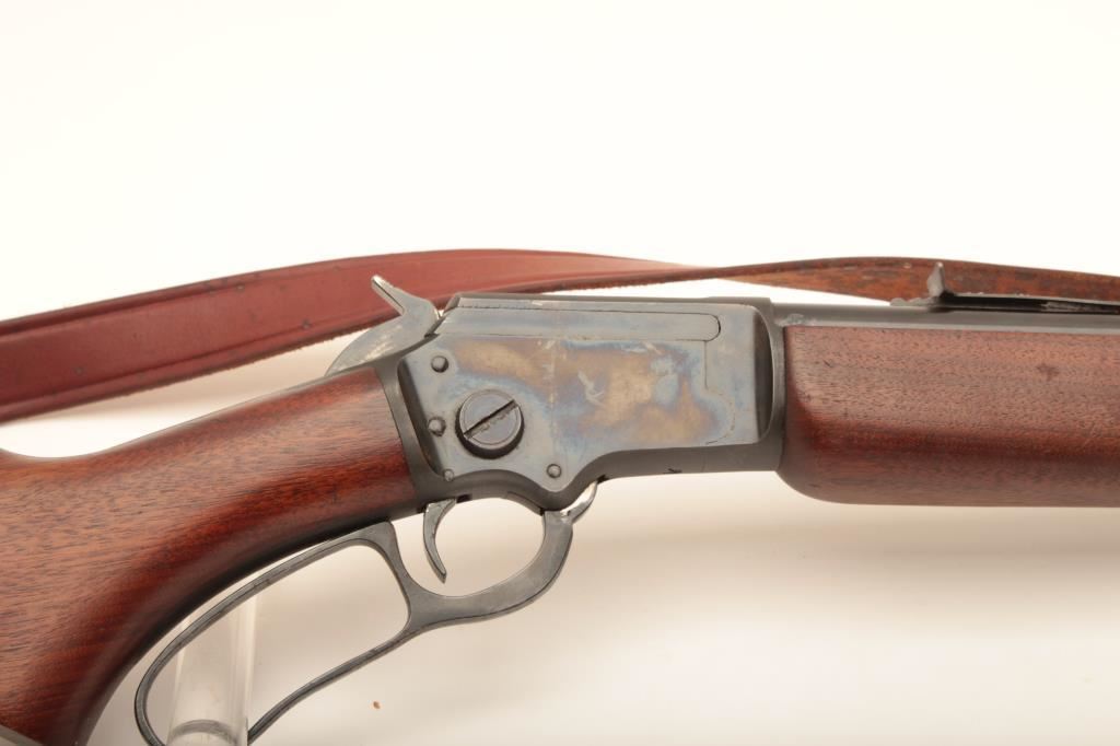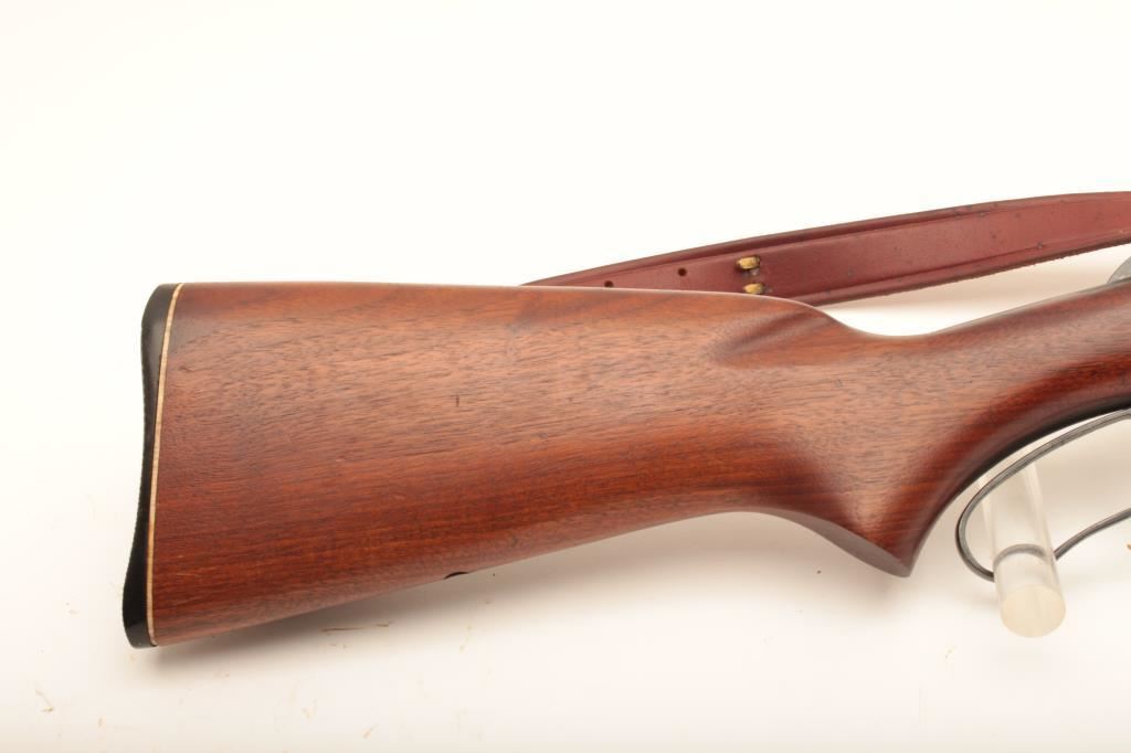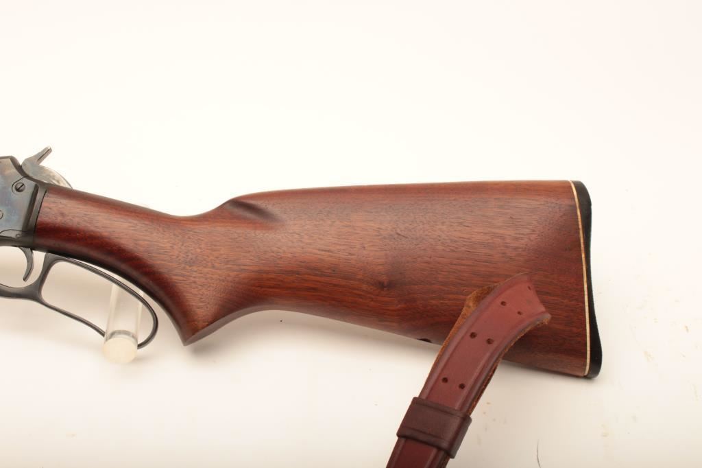 Marlin Model 39A lever action rifle, .22 caliber, Serial #N14261. The rifle is in fine overall condition with a 24” barrel. The barrel retains nearly all of its blue finish with a hooded blade front and standard rear sights. The receiver retains the majority of its blue finish and has been drilled and tapped for a receiver sight. The smooth wood stocks are in very good condition with a plastic, Marlin marked butt plate. The bore is good, the action is crisp and the markings are sharp. The lot includes sling swivels and a period leather sling. Est.: $150-$300. (Modern).