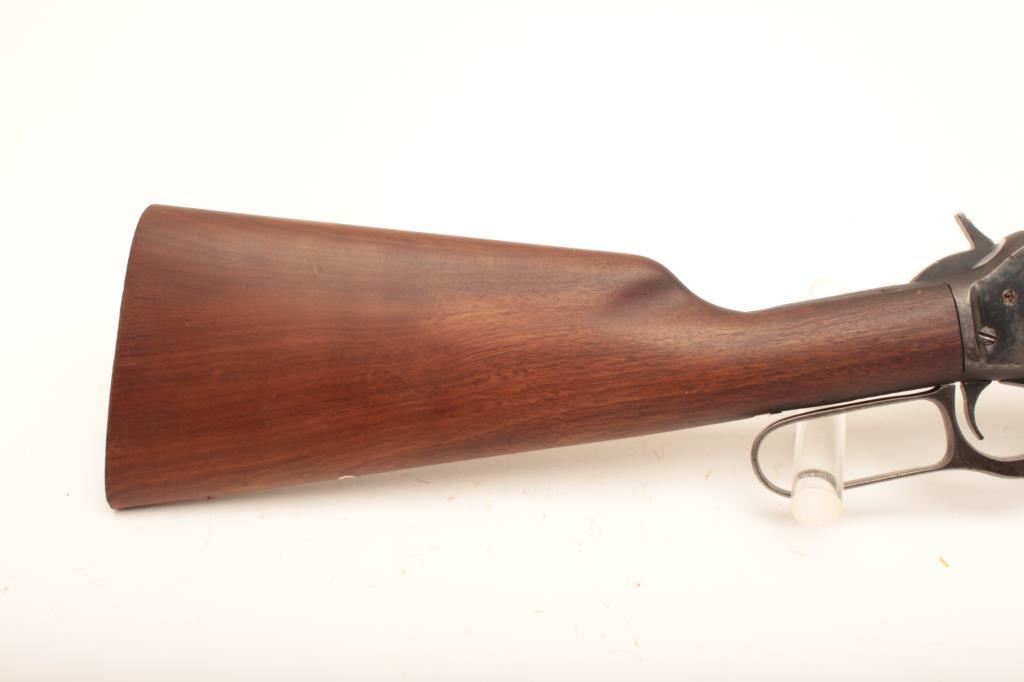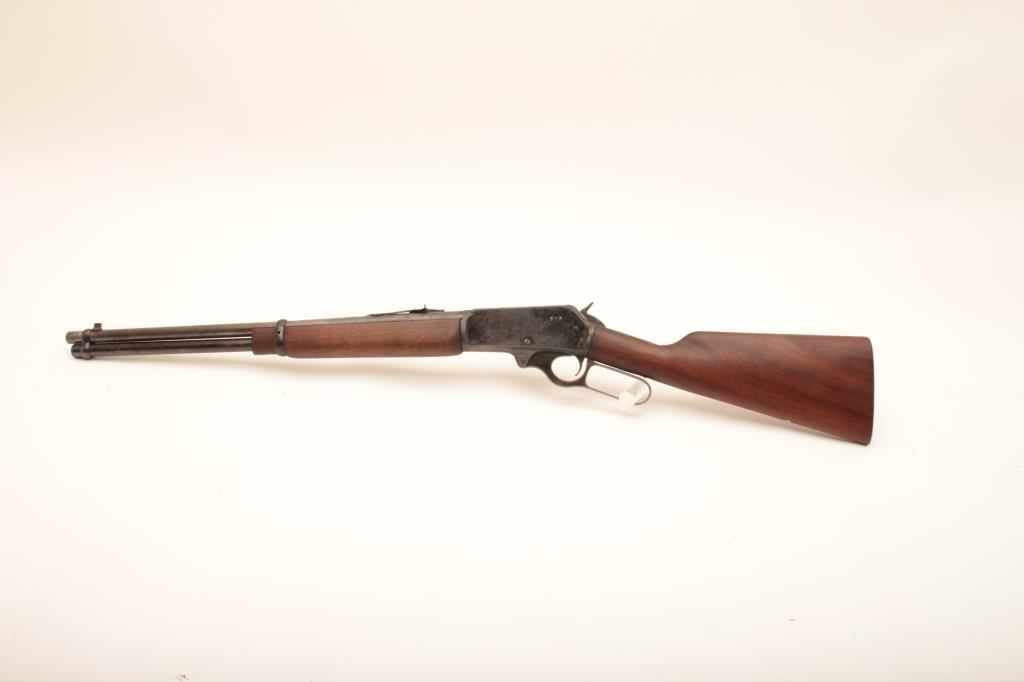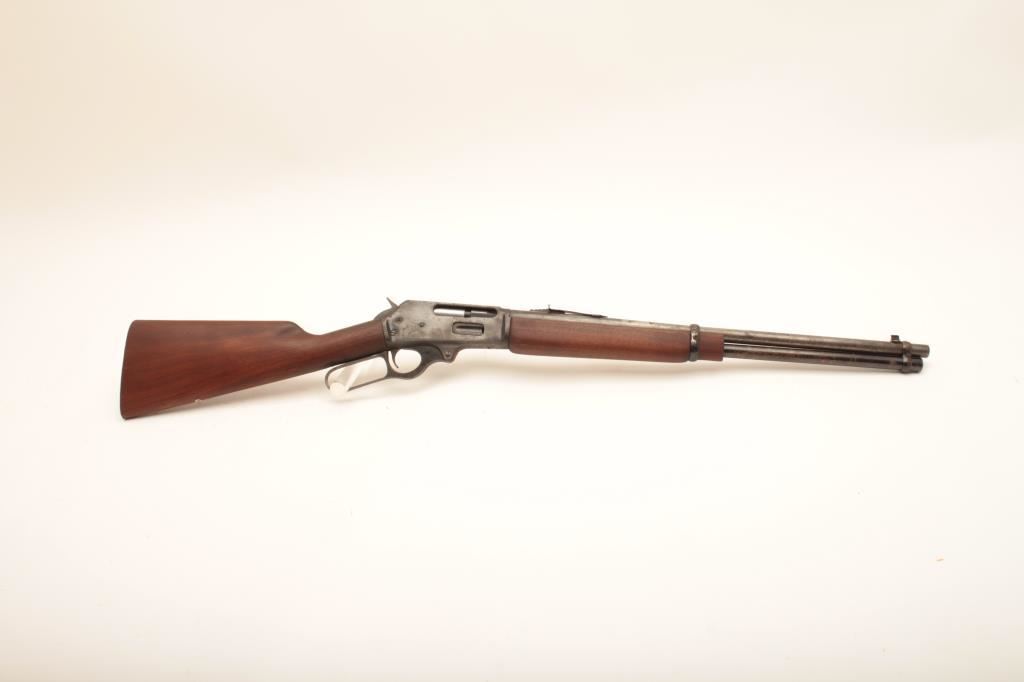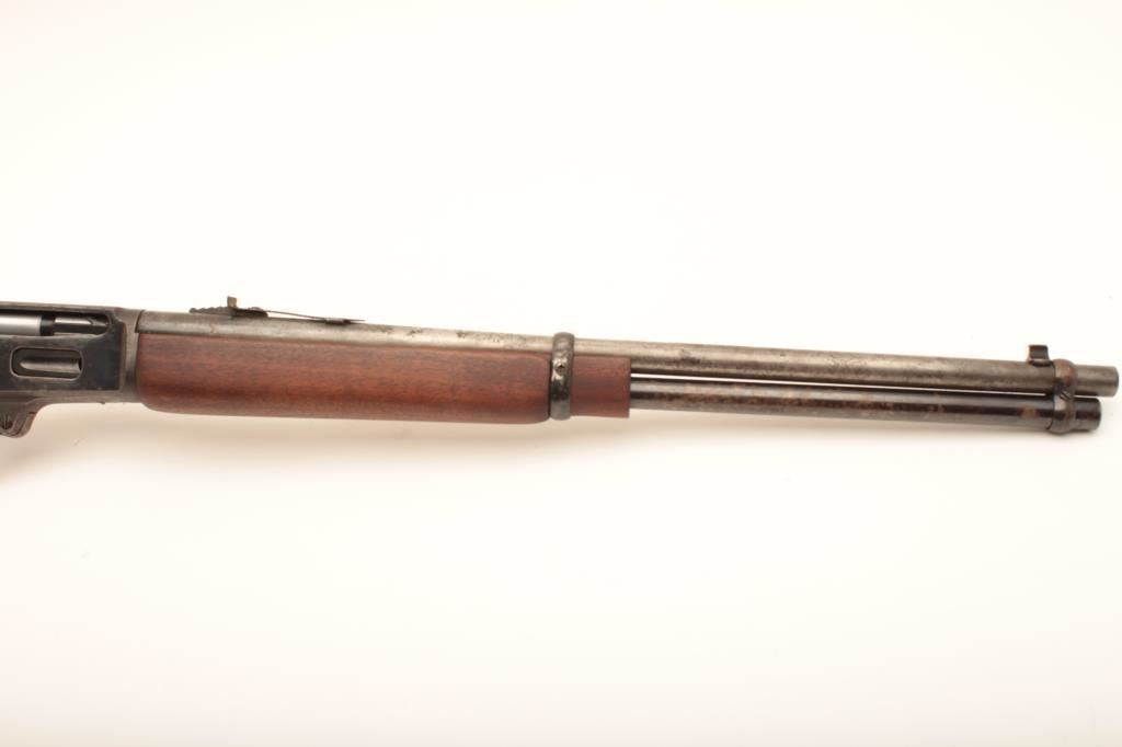 Marlin Model 336 RC lever action carbine, .30-30 caliber, Serial #K84738. The carbine is in fair overall condition with a 20” barrel. The barrel has gone to grey patina while the full-length magazine shows considerable blue finish. The receiver retains the majority of its blue finish with light to moderate surface erosion and has been drilled and tapped for a receiver sight. The lever assembly retains muted case hardening. The smooth wood stocks are in good condition with the butt plate removed. The bore is fair, the action functions and the markings are legible. Est.: $150-$300. (Modern).