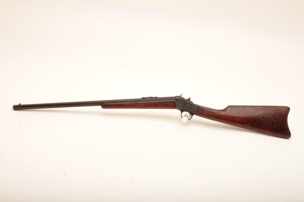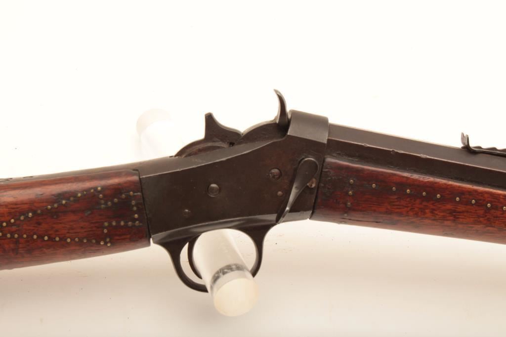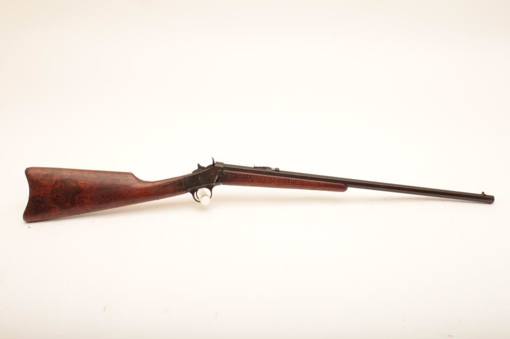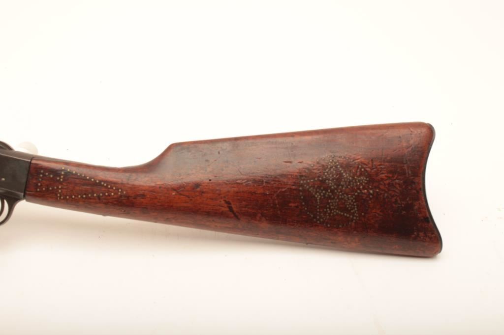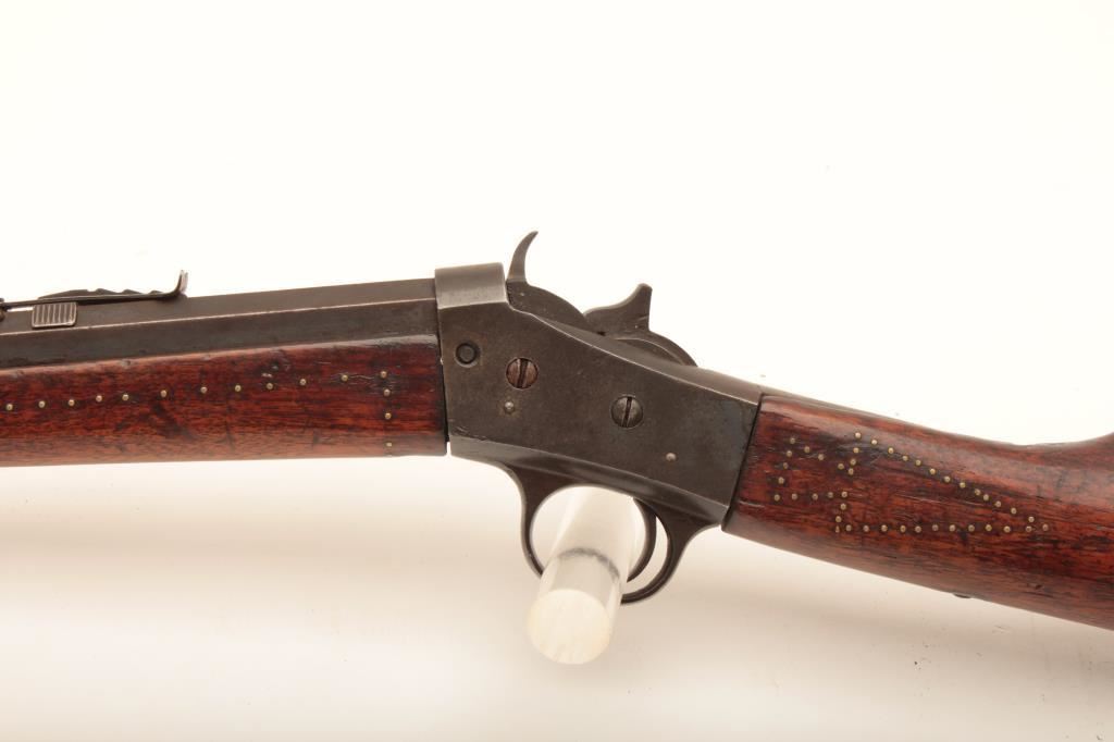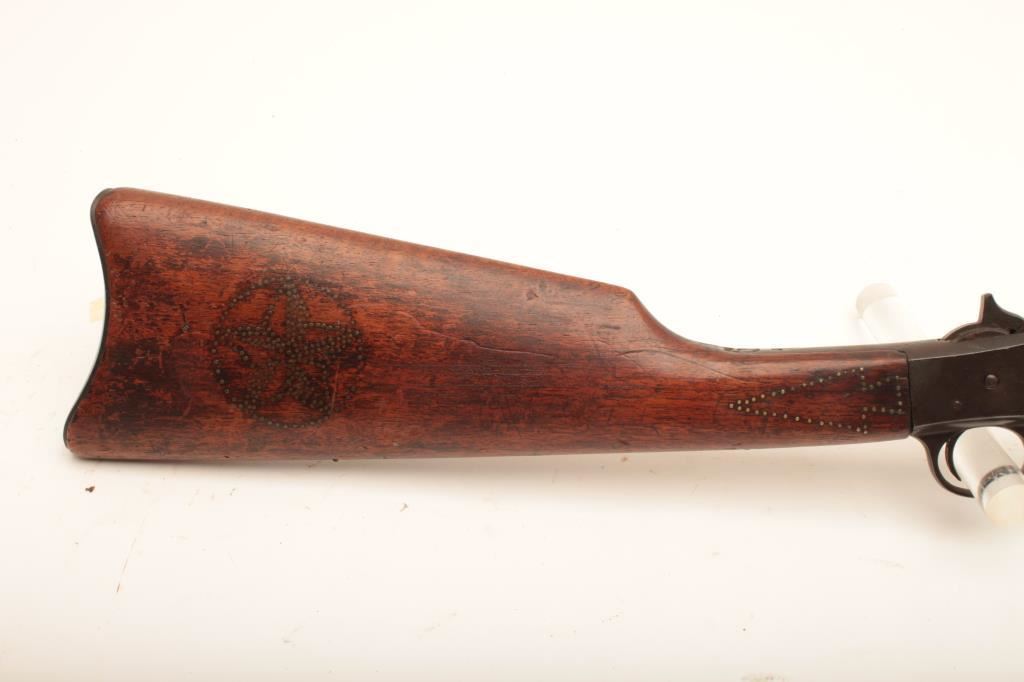 Remington Rolling Block single shot rifle, .22 caliber, 22” octagon barrel, blued finish, wood stocks with period small brass tack decoration: star, Indian Head, cross and borders; classic “Old West” with fair bore, good action, plum brown patina mixed with muted blued finish. (C&R). Est.: $250-$500.