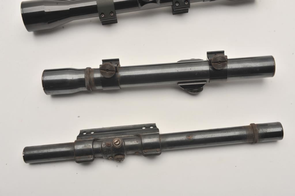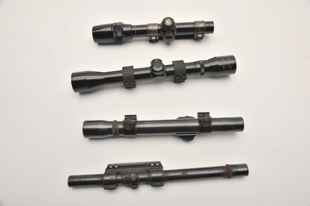 Lot of four vintage rifle scopes. The lot includes: a Weaver K 2.5 fixed, a JC Higgins 4X fixed, an Opti-Cote 4 x 32 fixed and a Bushnell Scope Chief 1.5 x 4.5 variable power. All four are in good overall condition and the lot includes four set of rings and two scope bases. Est.: $100-$200.