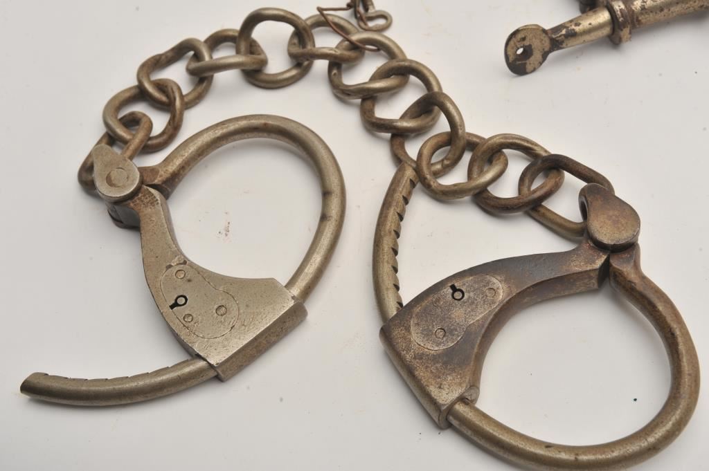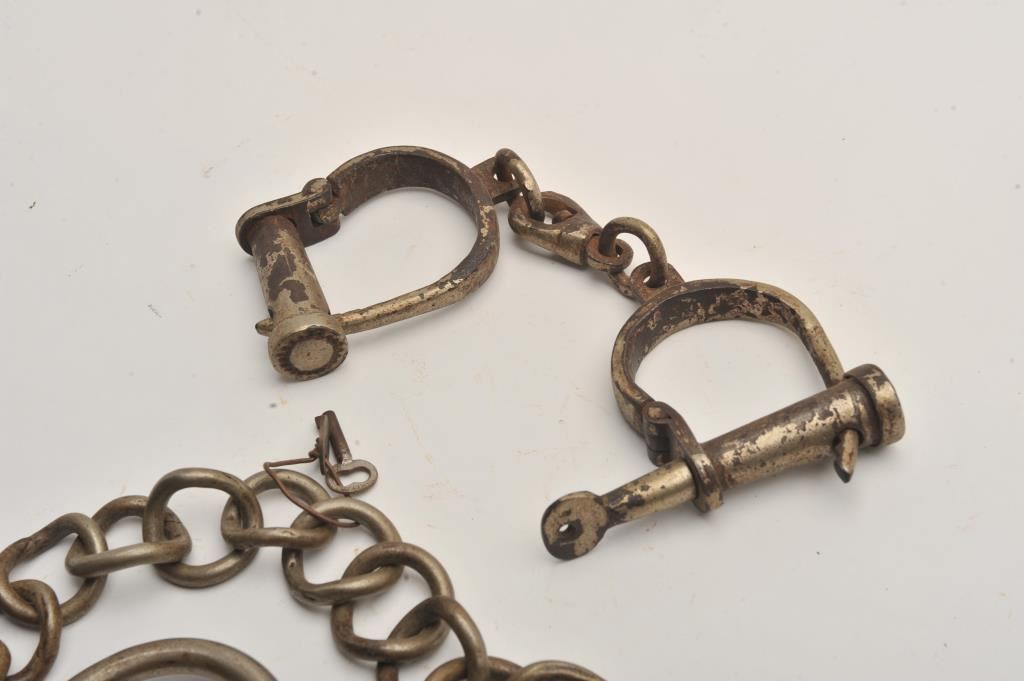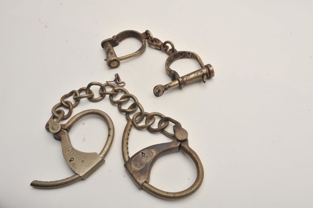 Vintage leg irons with key and a pair of vintage hand cuffs with screw type key. Est.: $150-$300.