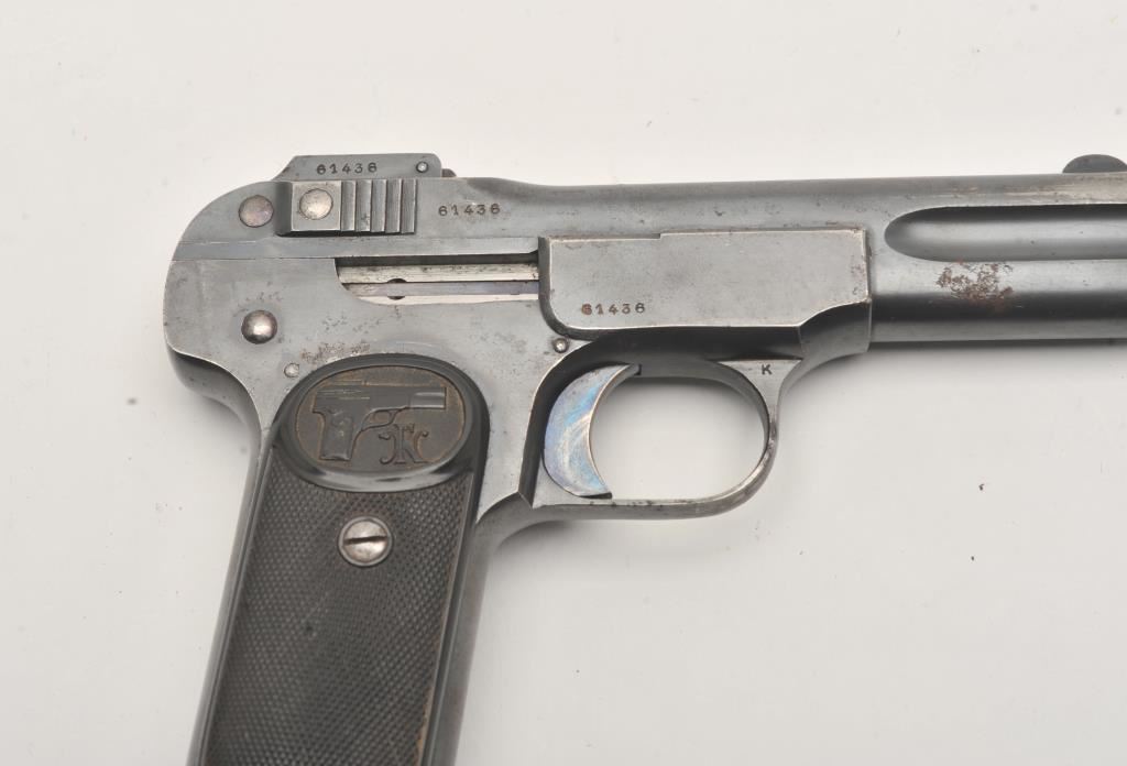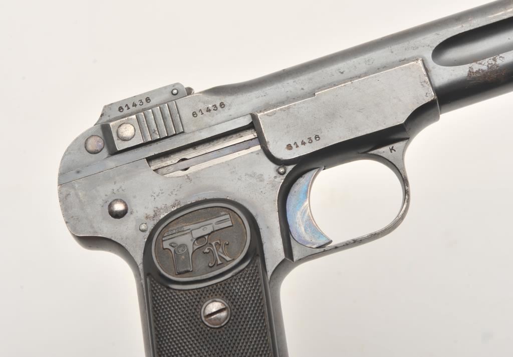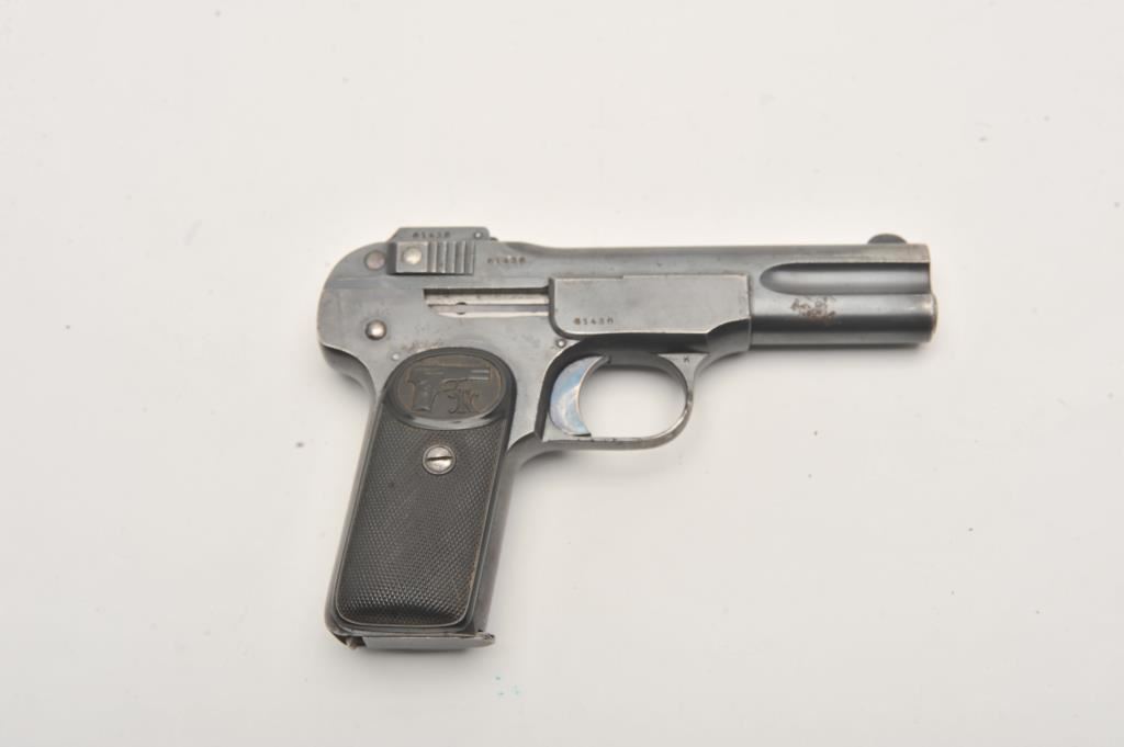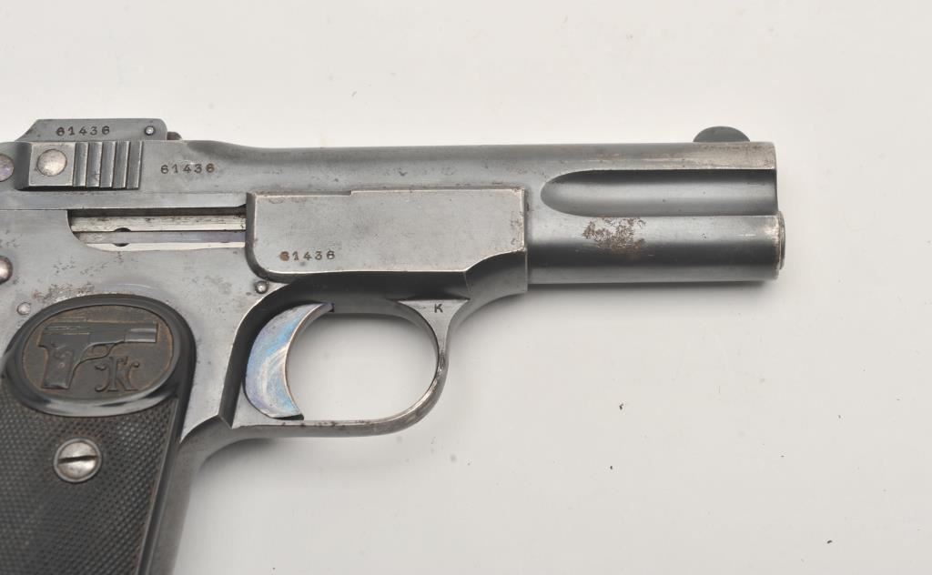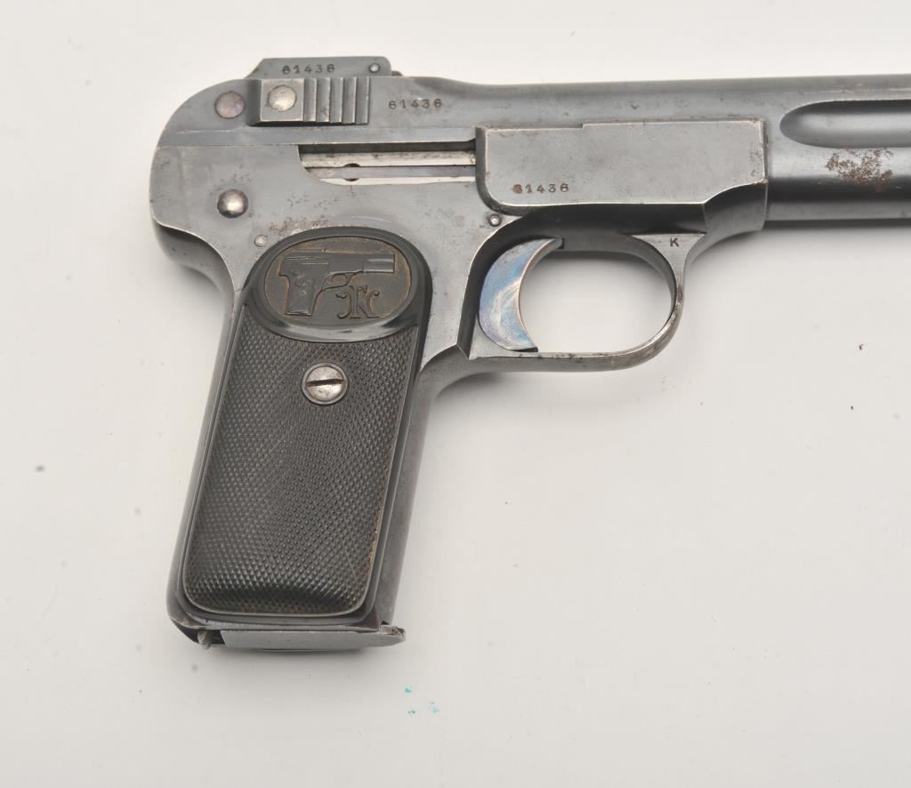 FN Browning Model 1900 semi-automatic pistol, .32 ACP caliber, Serial #61436. The pistol is in good overall condition with a 4” barrel. The pistol retains the majority of its muted blue finish with scratches, mars and loss of finish at the muzzle. The trigger shows traces of old, niter blue finish in the protected areas. The checkered hard rubber FN marked grips are in good condition with small mars and handling marks. The bore is fair, the action is crisp and the markings are sharp. The lot includes one correct magazine. Est.: $200-$400. (C+R).