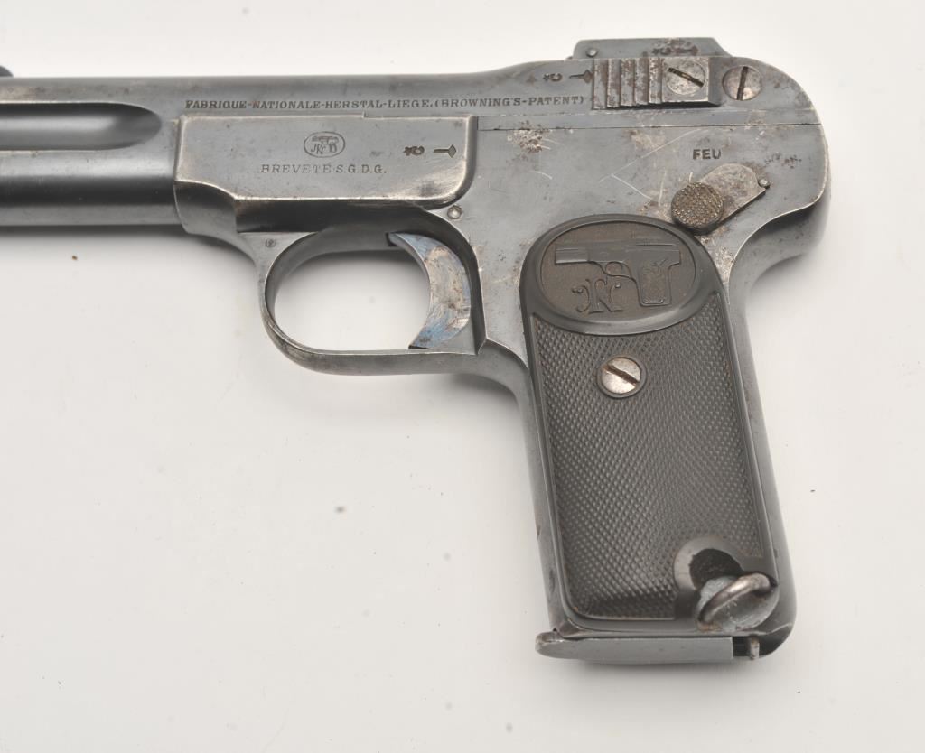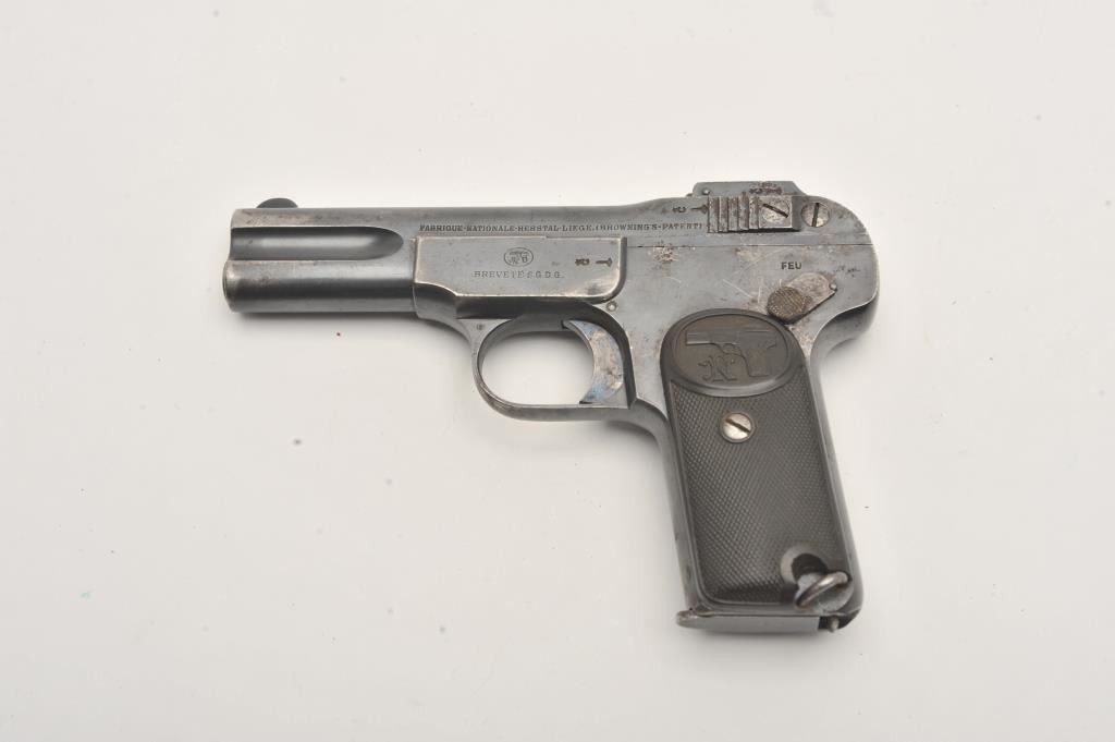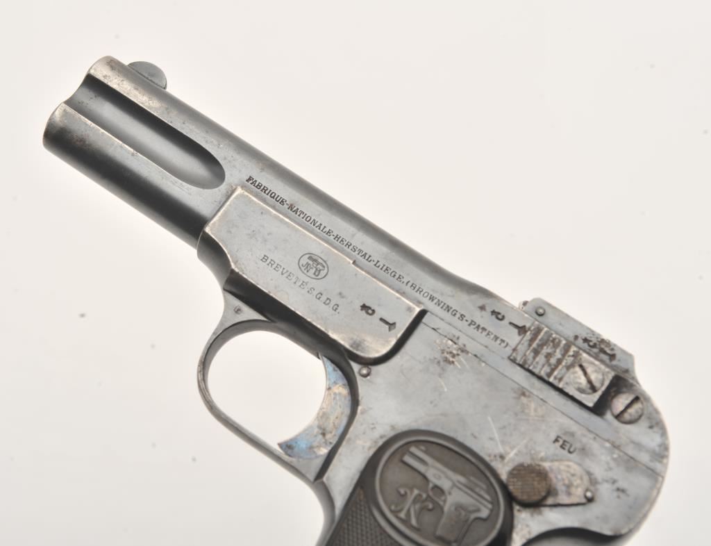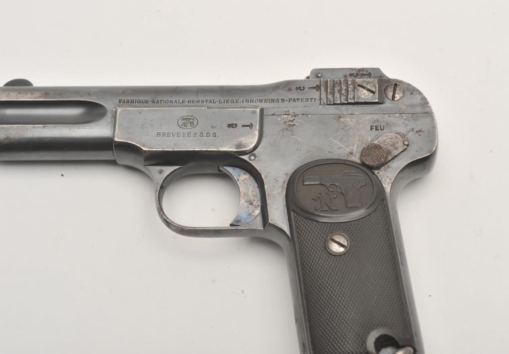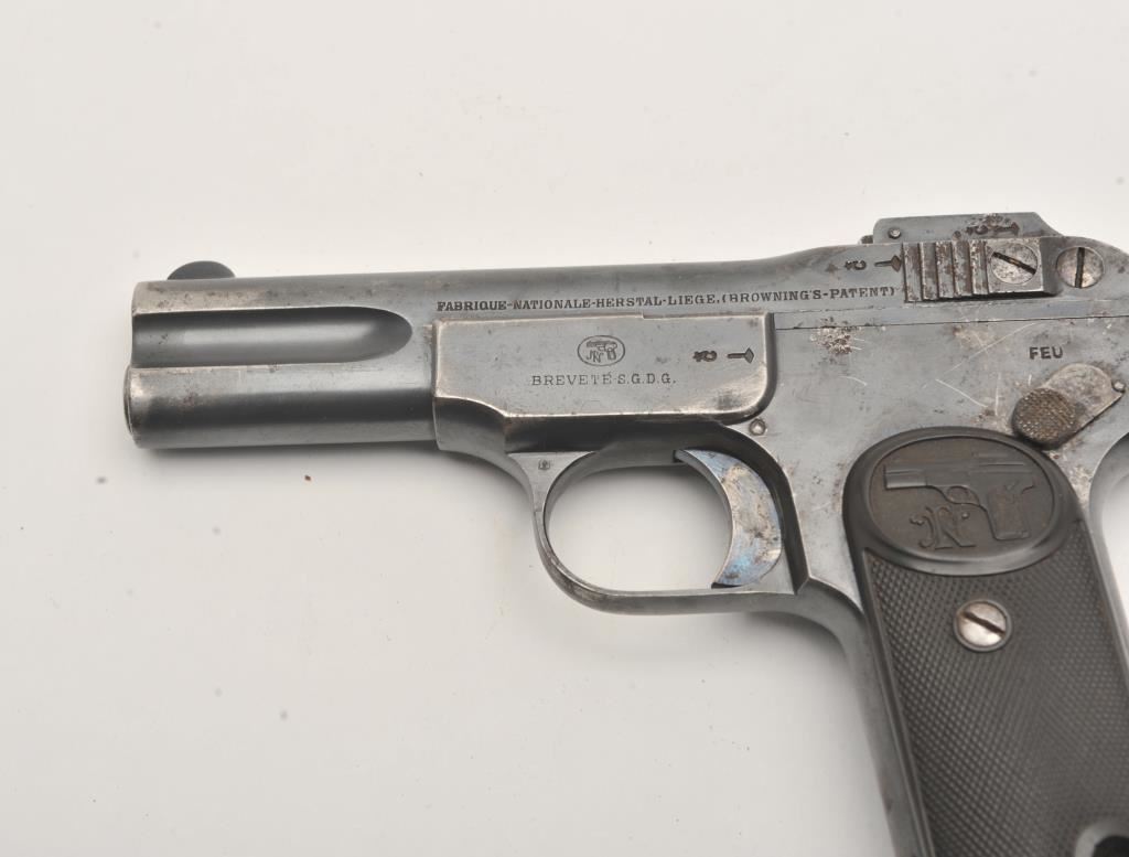 FN Browning Model 1900 semi-automatic pistol, .32 ACP caliber, Serial #61436. The pistol is in good overall condition with a 4” barrel. The pistol retains the majority of its muted blue finish with scratches, mars and loss of finish at the muzzle. The trigger shows traces of old, niter blue finish in the protected areas. The checkered hard rubber FN marked grips are in good condition with small mars and handling marks. The bore is fair, the action is crisp and the markings are sharp. The lot includes one correct magazine. Est.: $200-$400. (C+R).
