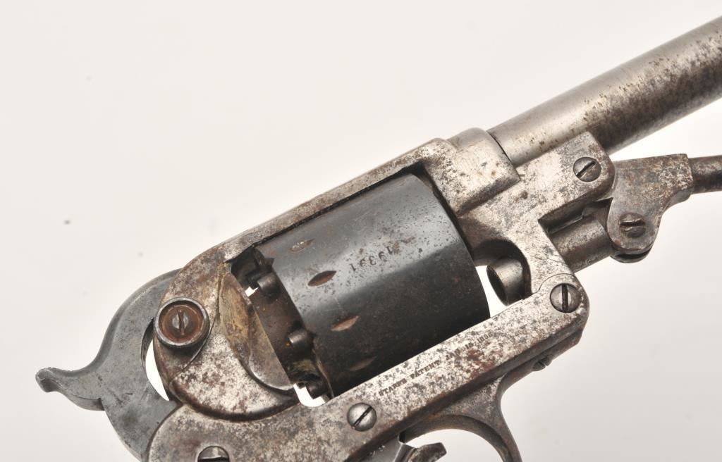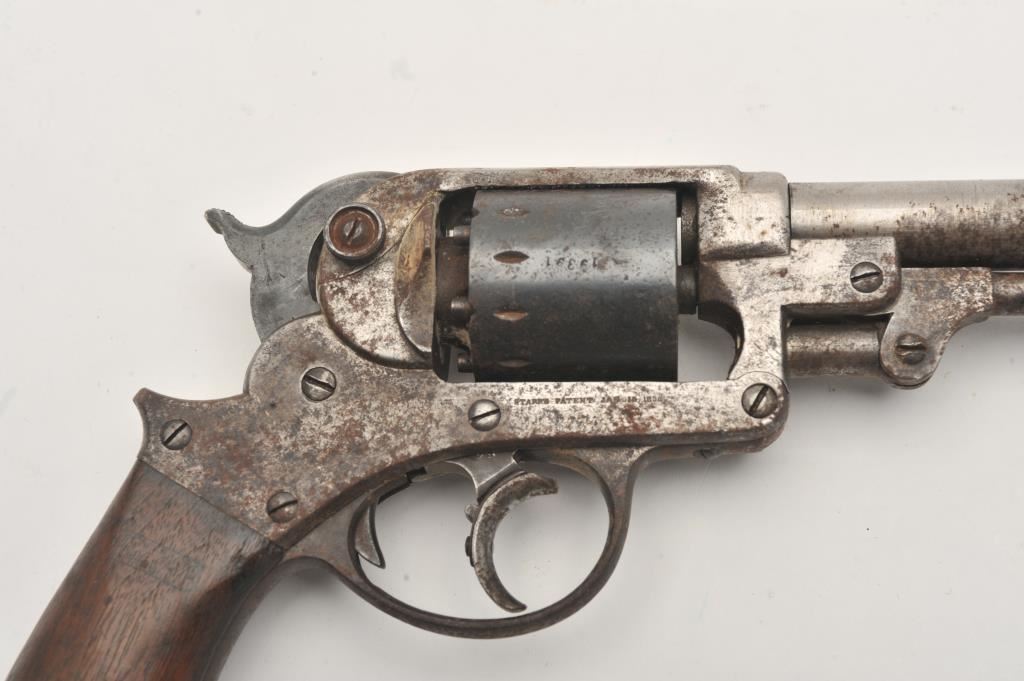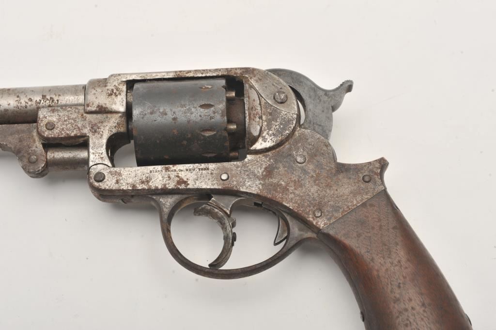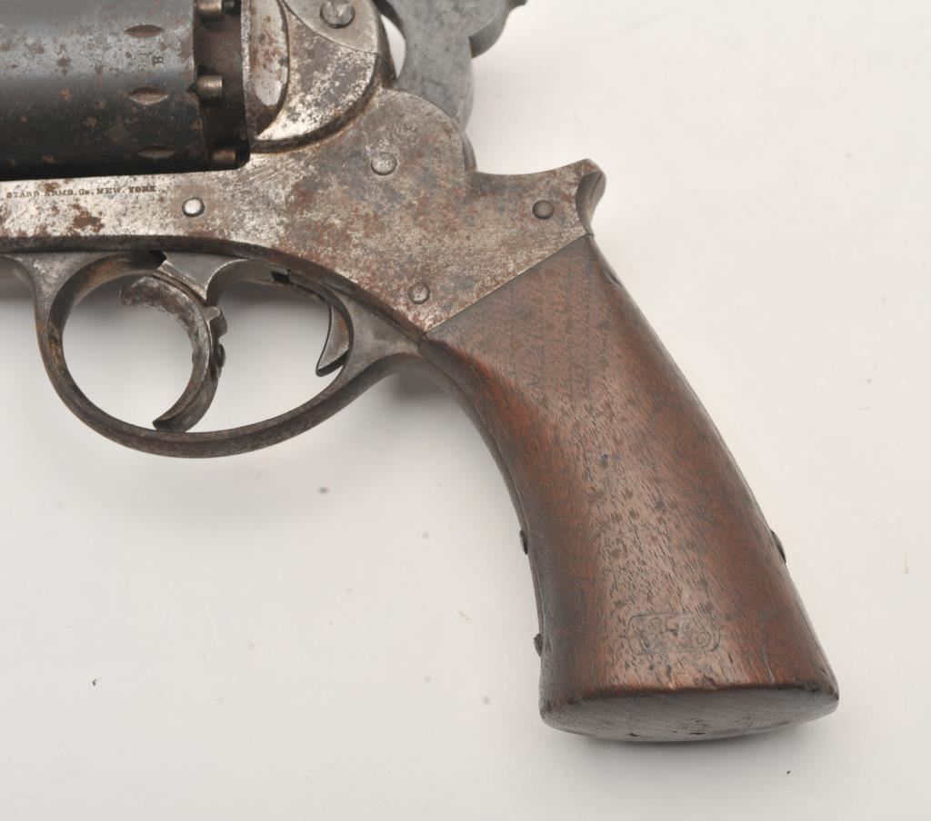 Starr Arms percussion revolver, .44 caliber, Serial #19391. The pistol is in fair overall condition with a barrel shortened to 5” during the period of use. The metal surfaces show heavy wear and use with light to moderate surface rust evident. The action is not working at the time of description. The smooth wood grips are in good condition with a nice cartouche on the right side. The bore is rough and markings are legible. Est.: $150-$300. (Antique).