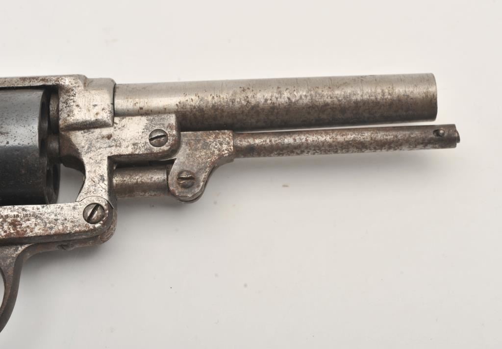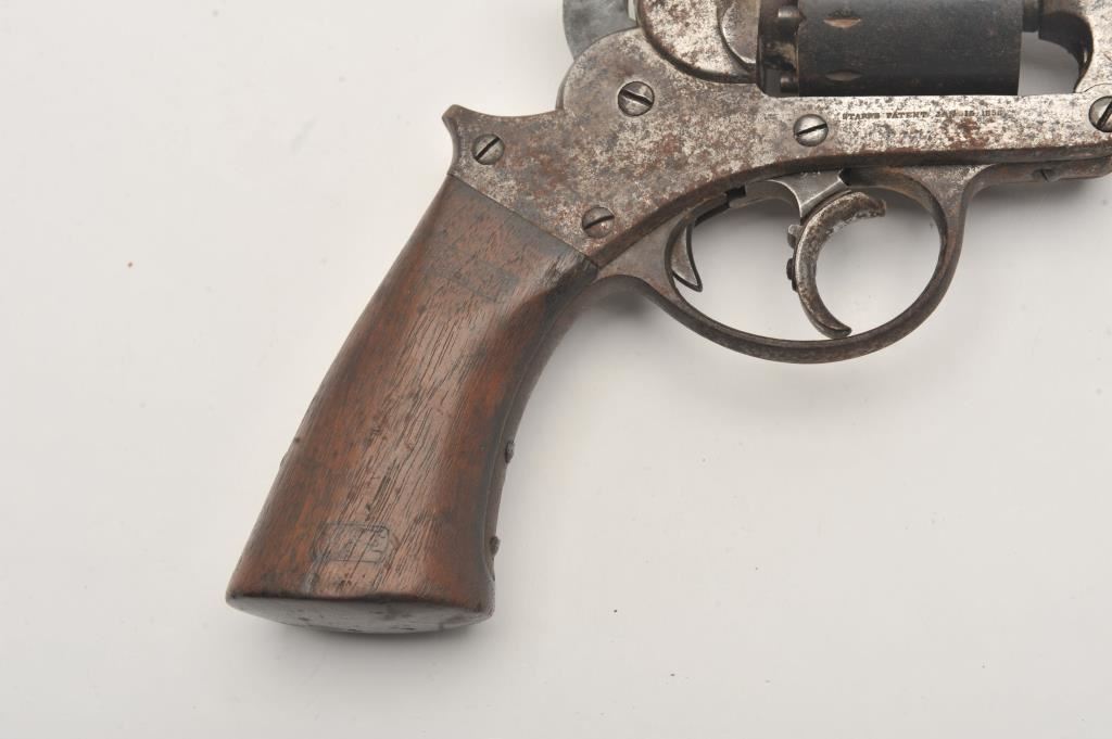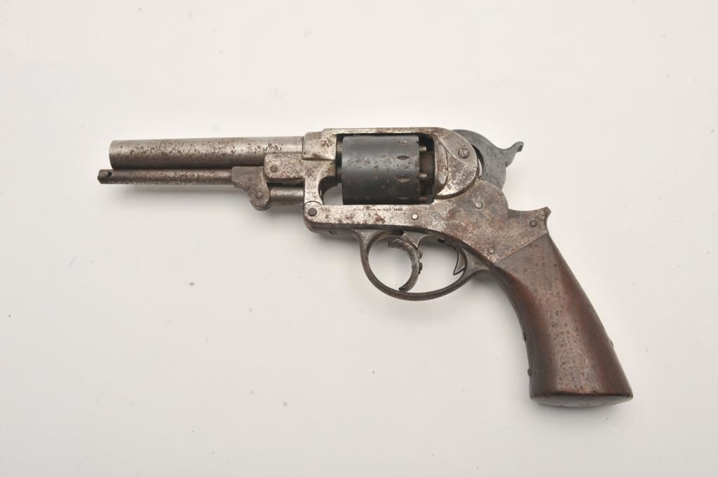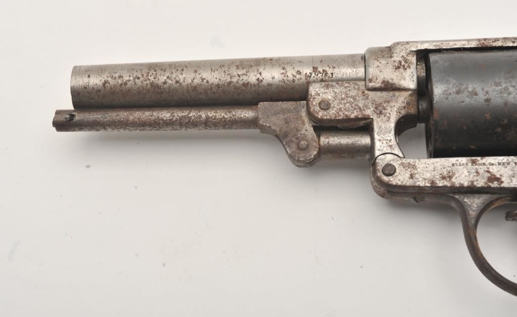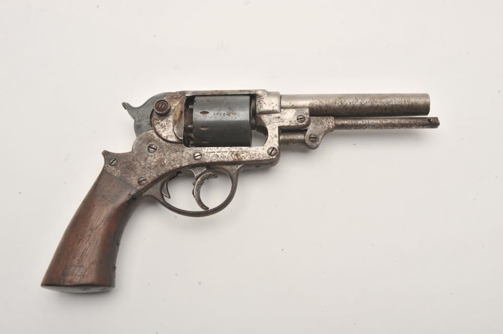 Starr Arms percussion revolver, .44 caliber, Serial #19391. The pistol is in fair overall condition with a barrel shortened to 5” during the period of use. The metal surfaces show heavy wear and use with light to moderate surface rust evident. The action is not working at the time of description. The smooth wood grips are in good condition with a nice cartouche on the right side. The bore is rough and markings are legible. Est.: $150-$300. (Antique).