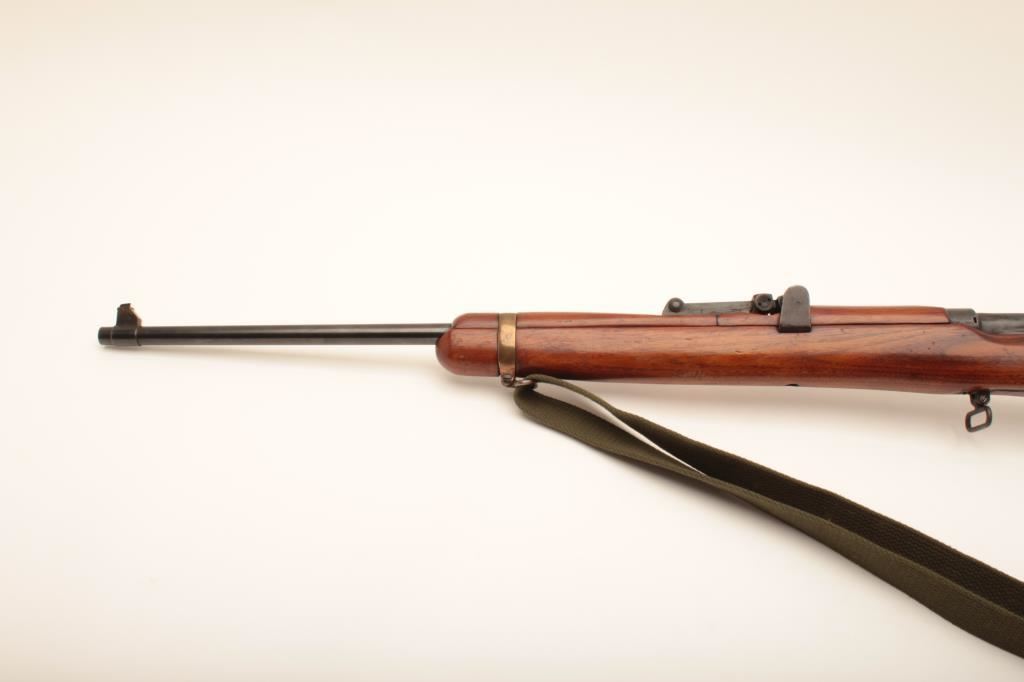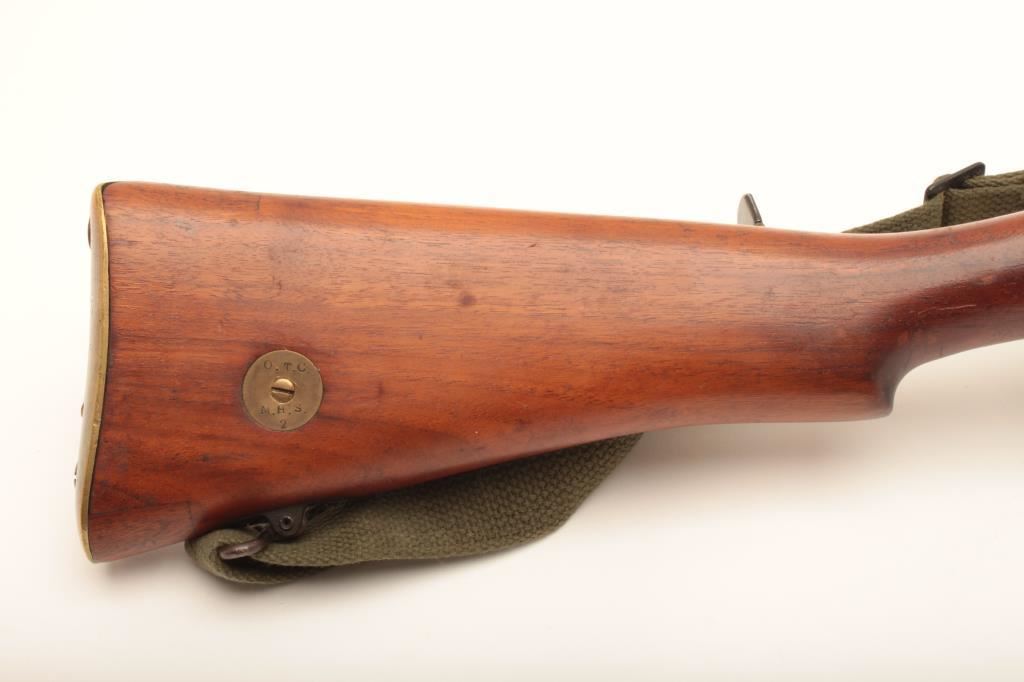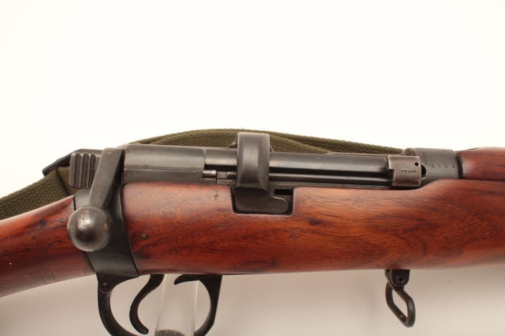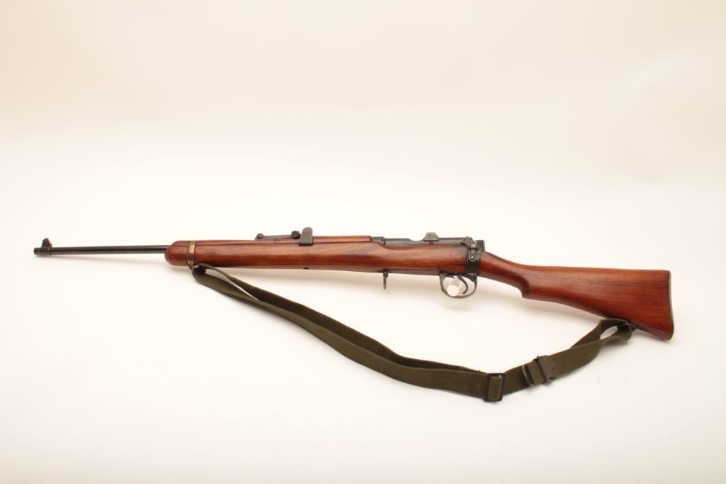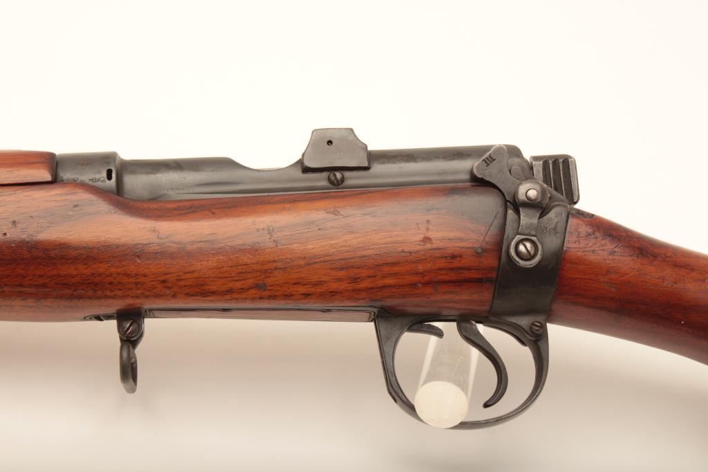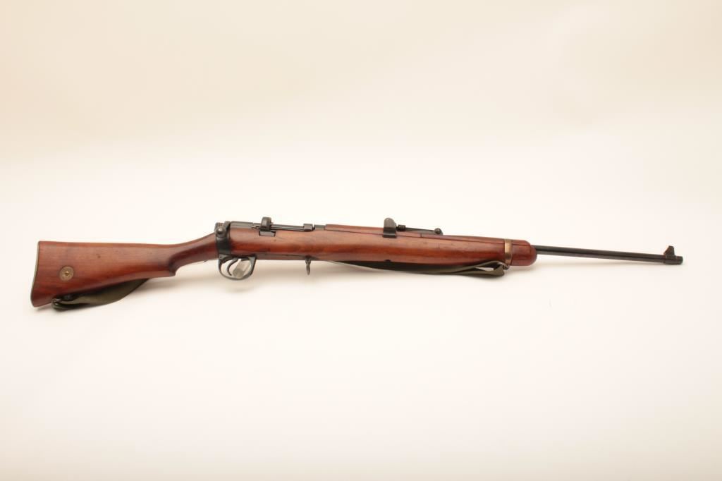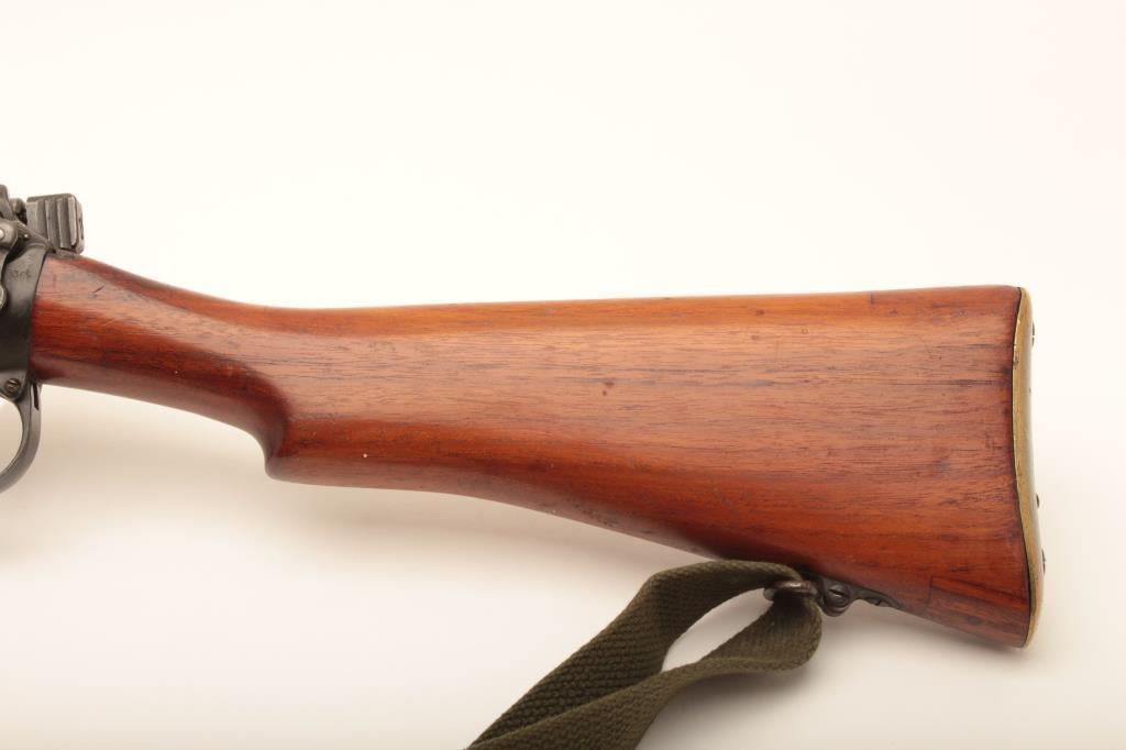 Lee-Enfield bolt action single shot sporting rifle, .22 caliber, Serial #4843. The rifle is in good overall condition with a 25” barrel. The metal surfaces retain the majority of their military finish. The rifle has been sporterized with the blade front and military tangent style sights retained. The rifle has been rechambered in .22 caliber with follower removed and magazine blocked. The smooth wood stock is in good condition. The bore is good, the action functions and markings are legible. Est.: $100-$200. (C+R).
