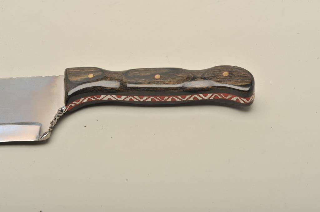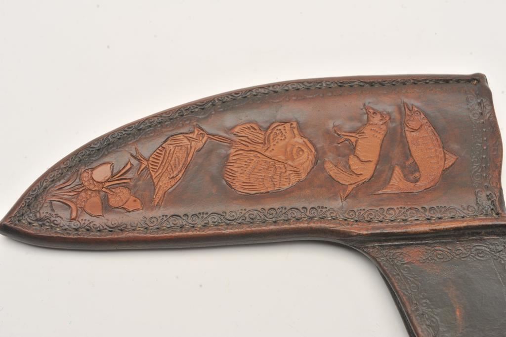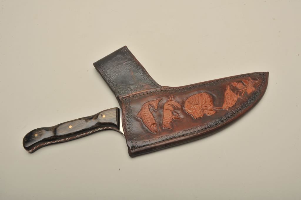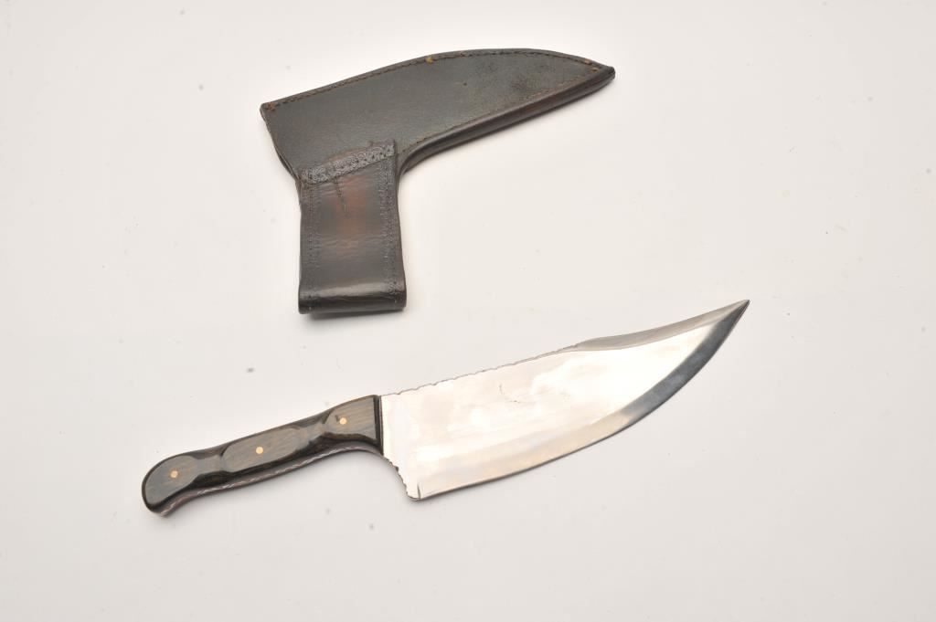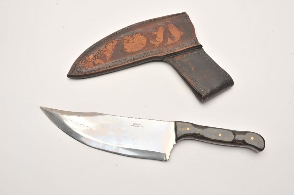 Custom made broad blade knife marked E. M. Curtis/Rowland Heights, CA; approximately 14” overall with a 9” blade; custom wood grip and accompanied by a carved leather sheath. Est.: $150-$300.