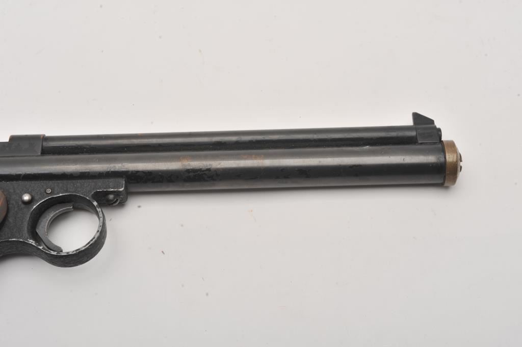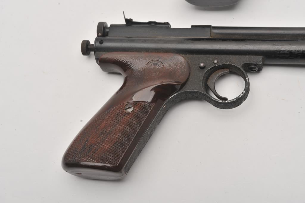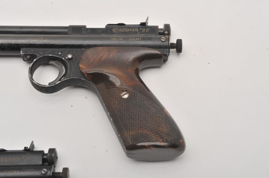 Lot of two Crosman CO2 air pistols. The first is a Crosman Model 112 .22 caliber pistol, Serial #251327 with an 8” barrel with the majority of the black finish still present. The checkered plastic grips are in good condition. The 2nd pistol is a Crosman Model 116 .22 caliber pistol, Serial #207093 with a 6” barrel with the majority of its black finish present. The checkered plastic grips are in good condition. Est.: $100-$200.
