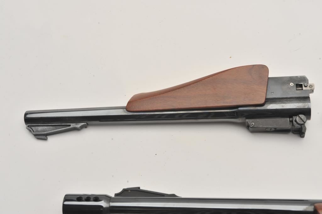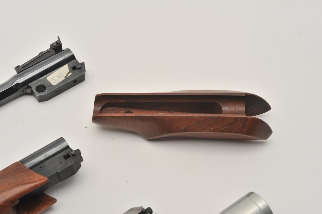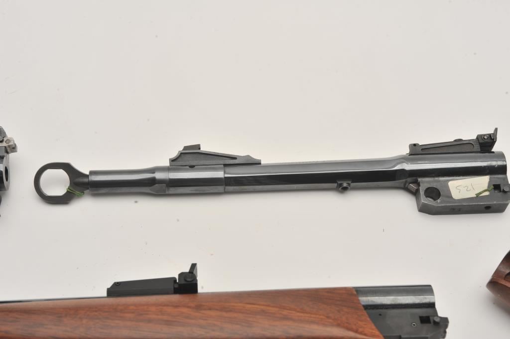 Lot of four Thompson Center barrels. The lot includes a 17” matte stainless in .218 Bee with a Leupold M8-2x Extended Relief pistol scope. A Super 16 chambered in .45-70 Govt. with smooth wood fore end, a 10” .221 Remington with smooth wood fore end and a 10” .44 Magnum barrel also with a smooth wood fore end. All four barrels are in very good condition, with good bores and come in a plastic storage container. Est.: $150-$300.