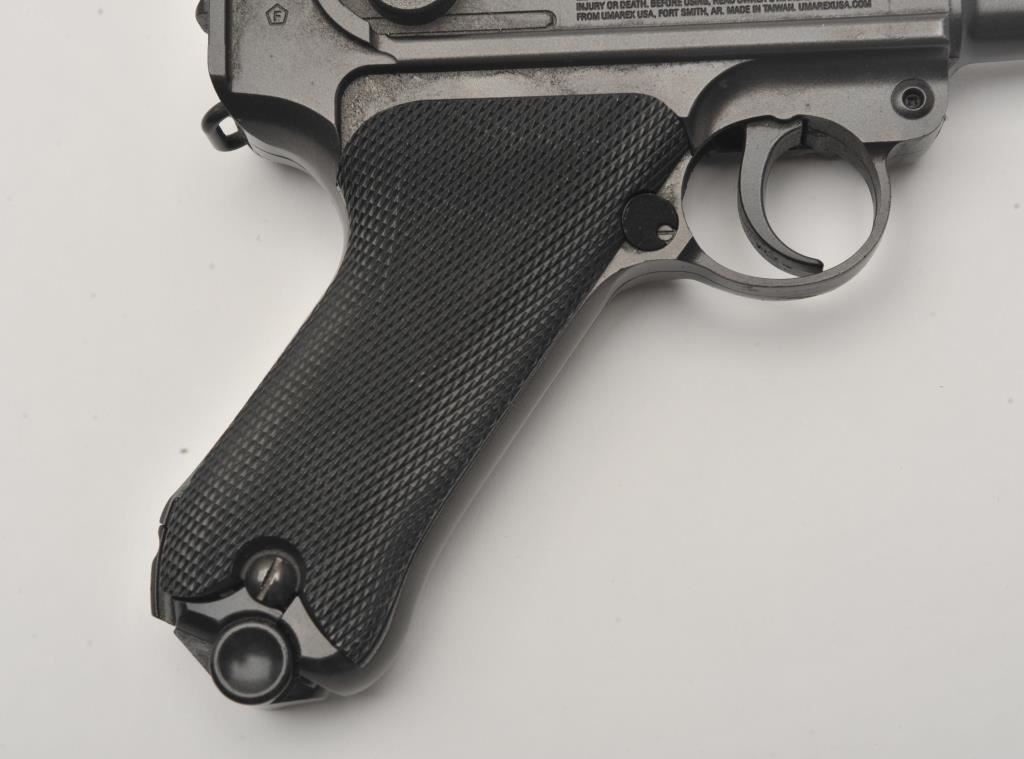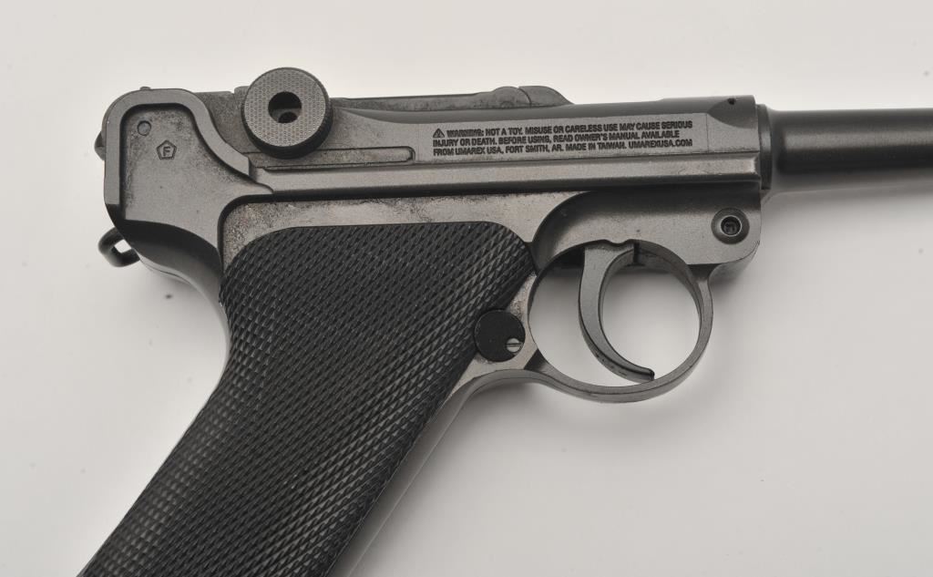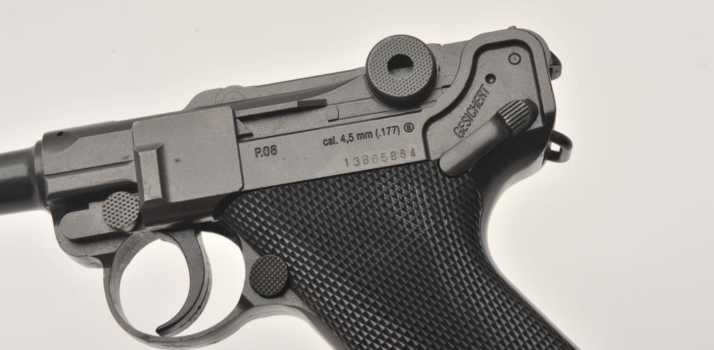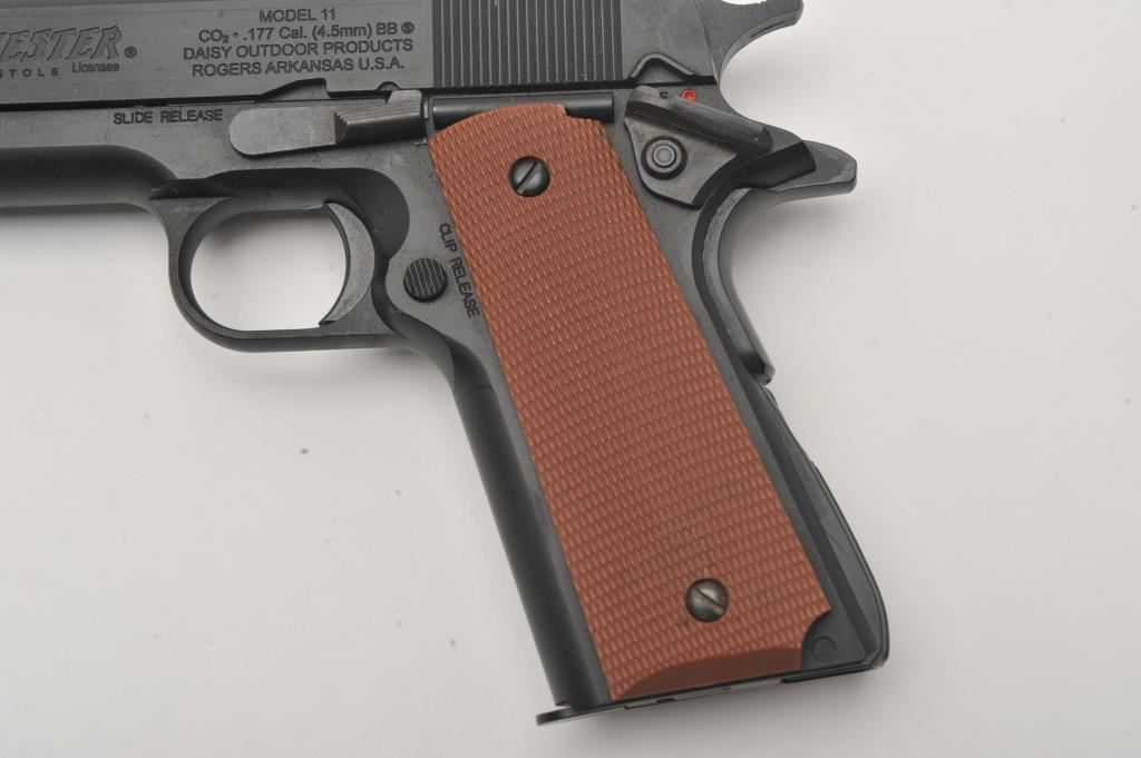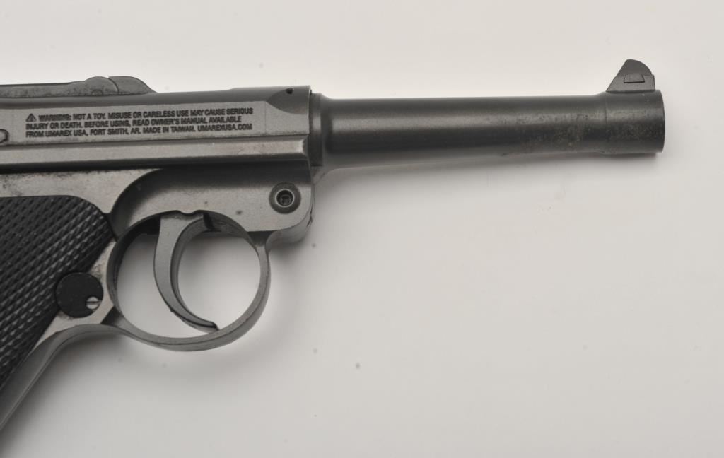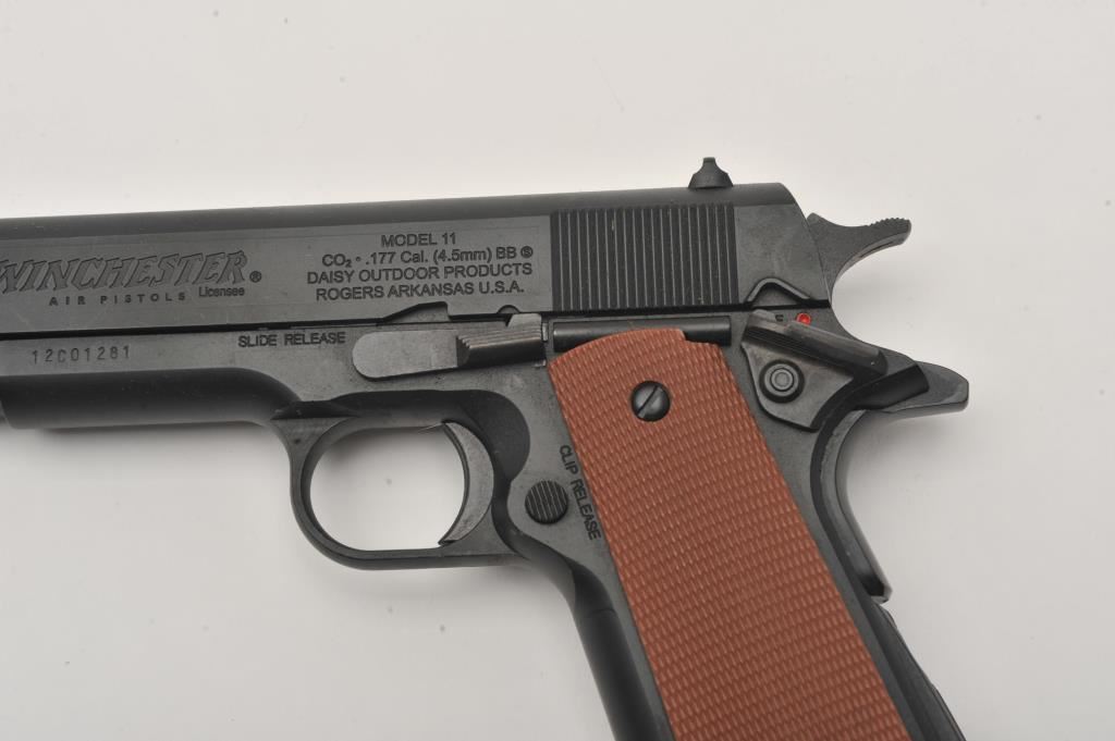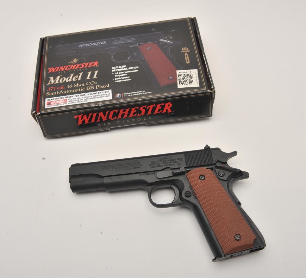 Lot of two .177 caliber CO2 air pistols. The lot includes a Winchester Model 11 air pistol in fine overall condition Serial #12C01281, in the original cardboard factory box. The lot also includes an Umarex Legends series Parabellum Pistole P.08 Luger air pistol as new in the factory cardboard box. Est.: $125-$250.