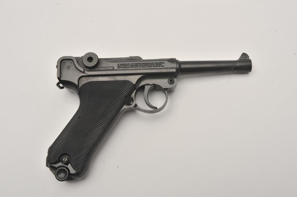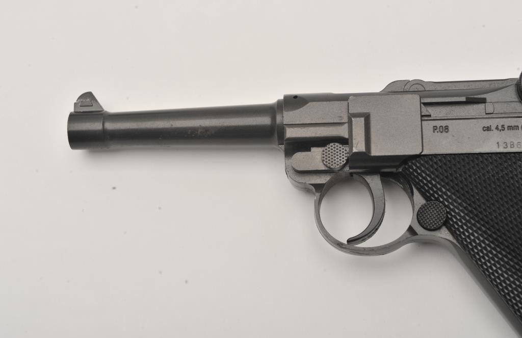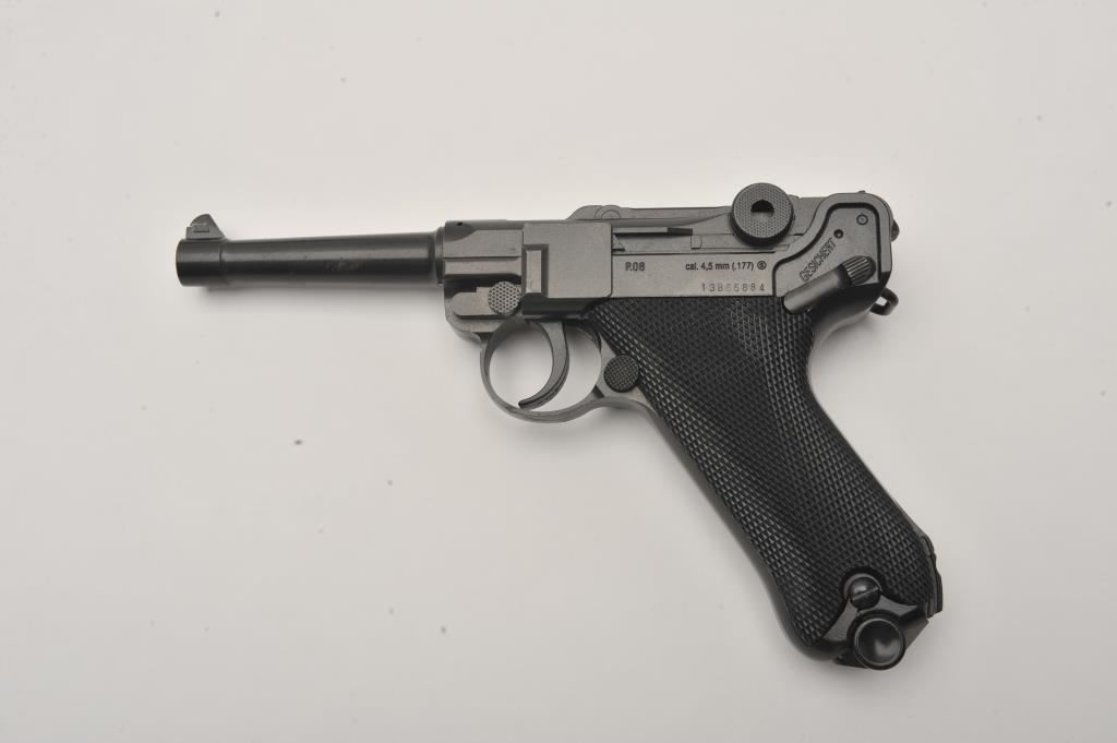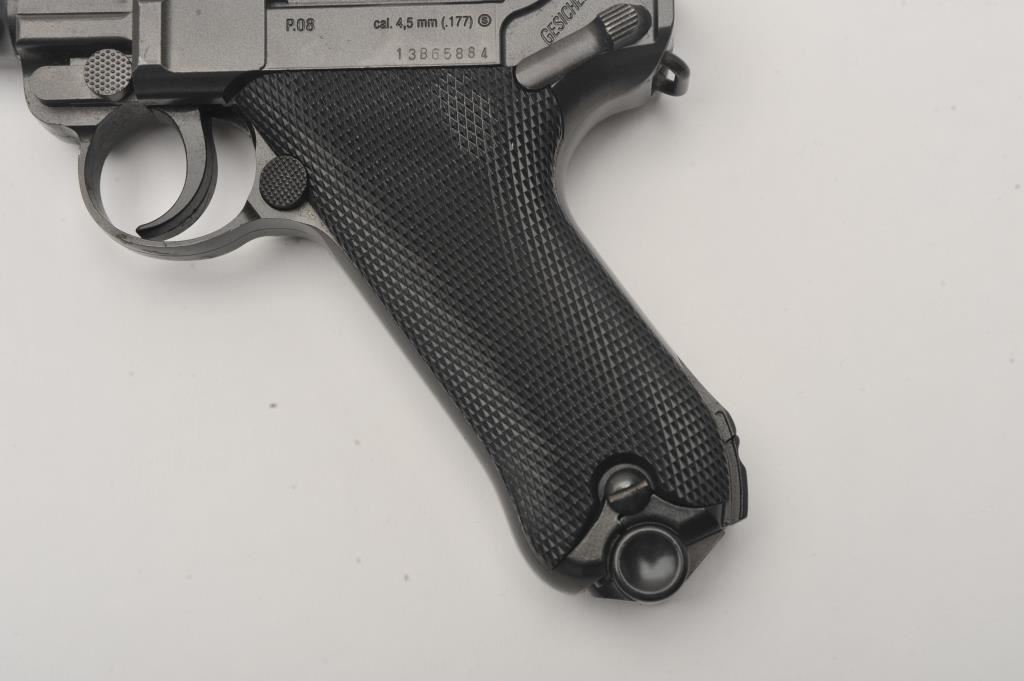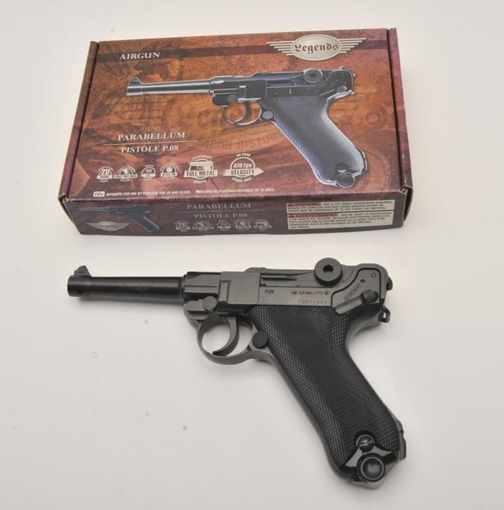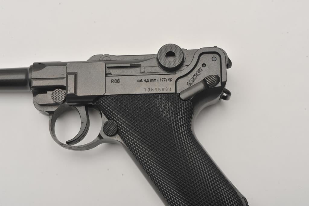 Lot of two .177 caliber CO2 air pistols. The lot includes a Winchester Model 11 air pistol in fine overall condition Serial #12C01281, in the original cardboard factory box. The lot also includes an Umarex Legends series Parabellum Pistole P.08 Luger air pistol as new in the factory cardboard box. Est.: $125-$250.