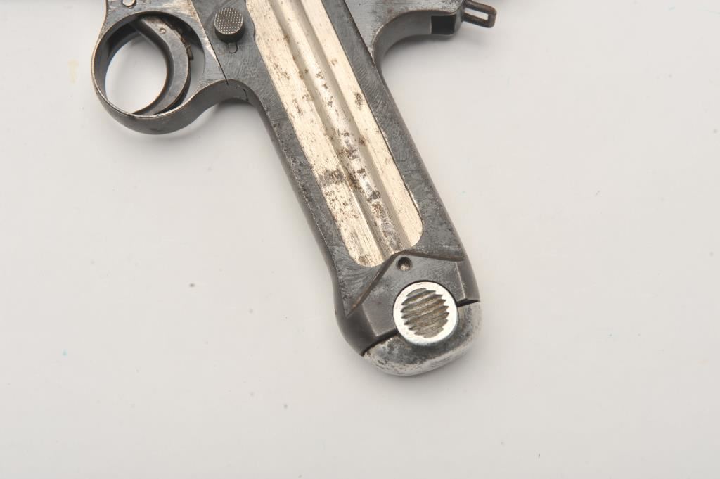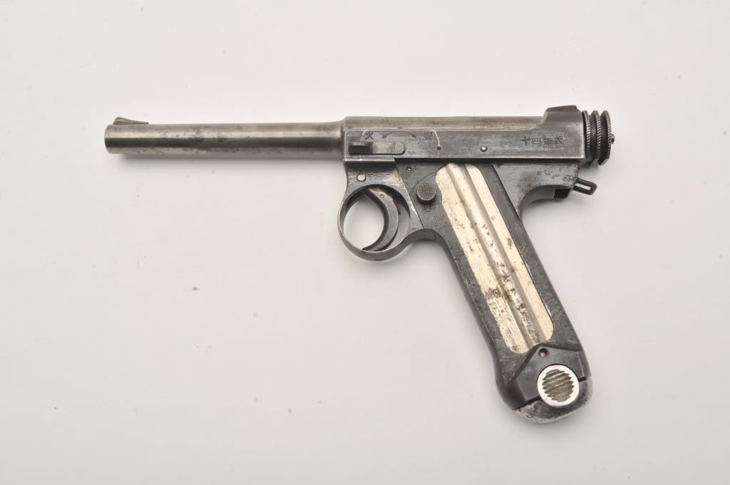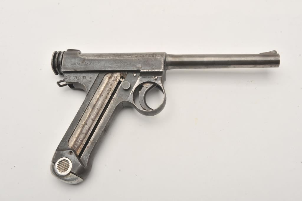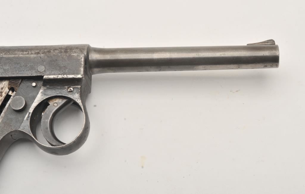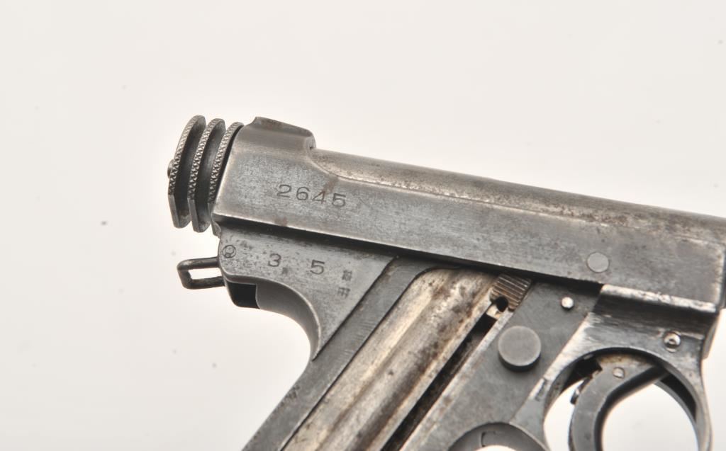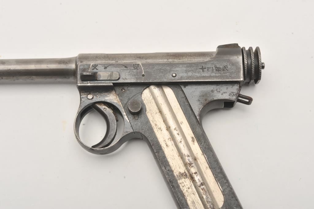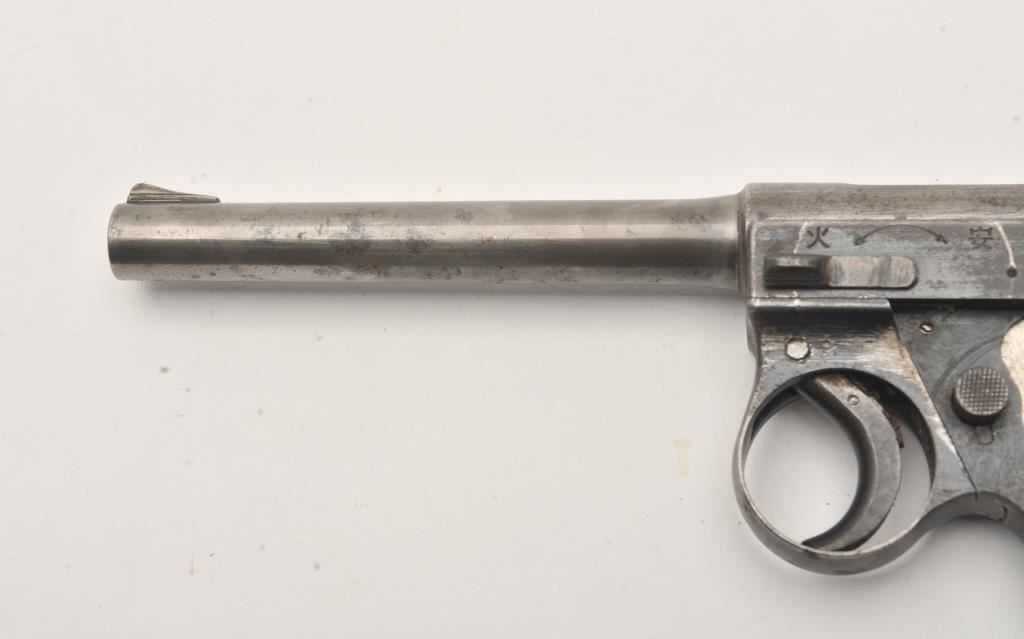 Type 14 Small Guard Nambu semi-automatic pistol, 8mm caliber, Serial #2645. The pistol is in fair overall condition with a 4 ½” barrel. The metal surfaces retain a significant amount of their military finish with the remainder going to a grey patina. The pistol is missing parts and the action is not functioning at the time of description and the pistol is sold as parts. The lot includes one correct magazine. The bore is fair, the action is non-functioning and the markings are legible. Est.: $100-$200. (C+R).