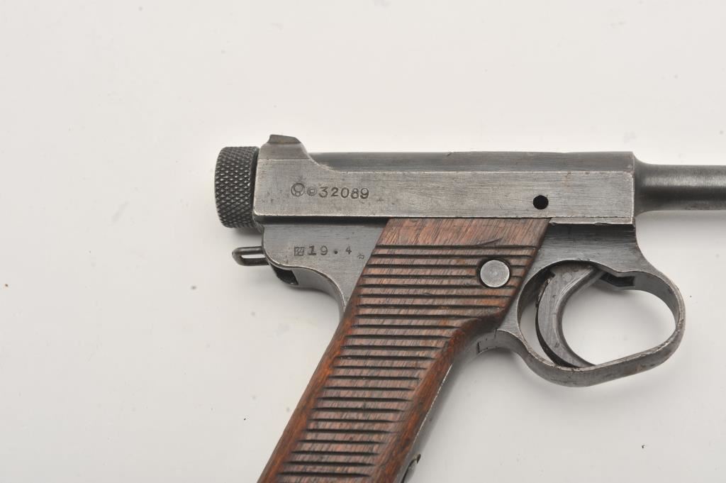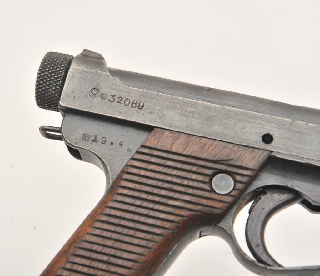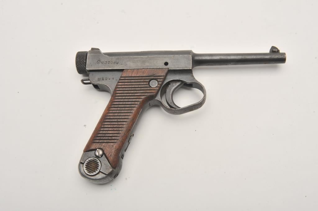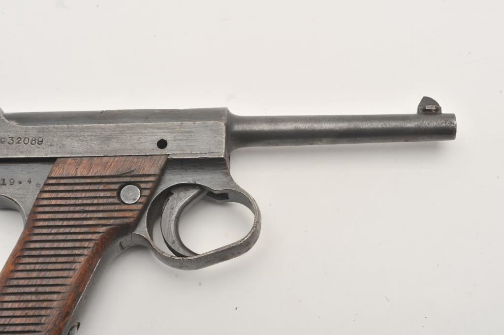 Type 14 Large Guard Nambu semi-automatic pistol, 8mm caliber, Serial #32089. The pistol is in good overall condition with a 5 ½” barrel. The metal surfaces retain a significant amount of their military finish with the remainder going to a grey patina. The pistol is missing the grip scales. The lot includes one correct, matching magazine. The bore is fair, the action functions and the markings are legible. Est.: $125-$250. (C+R).