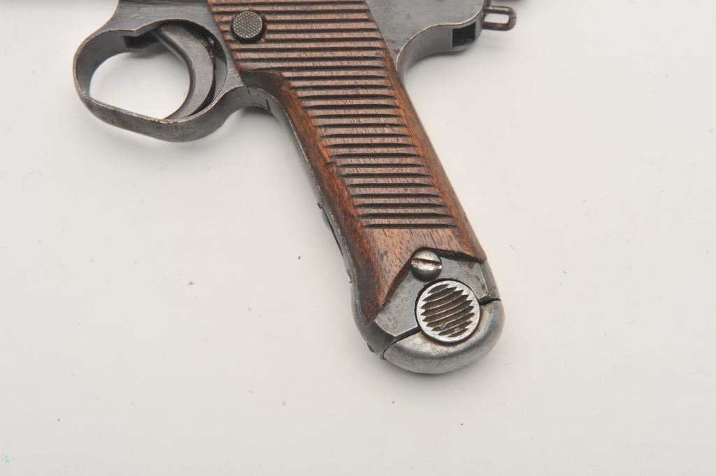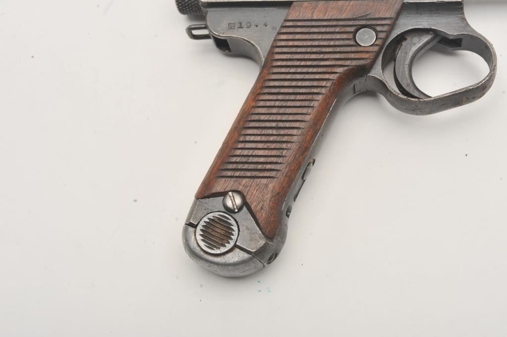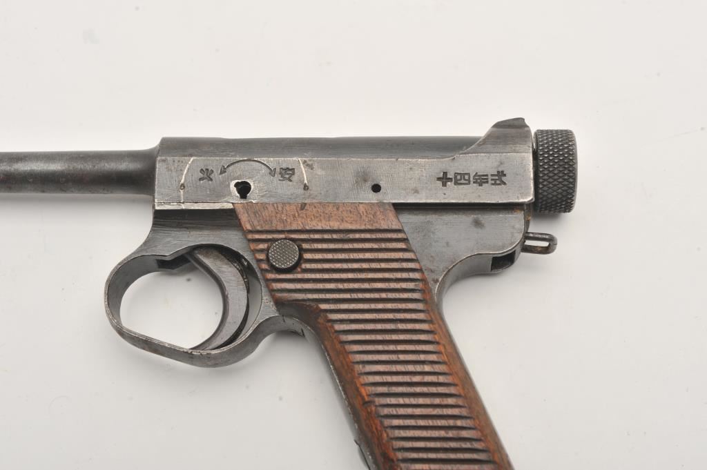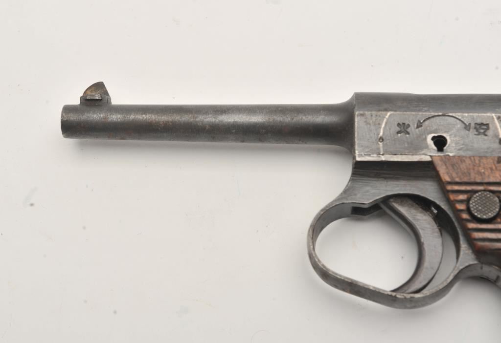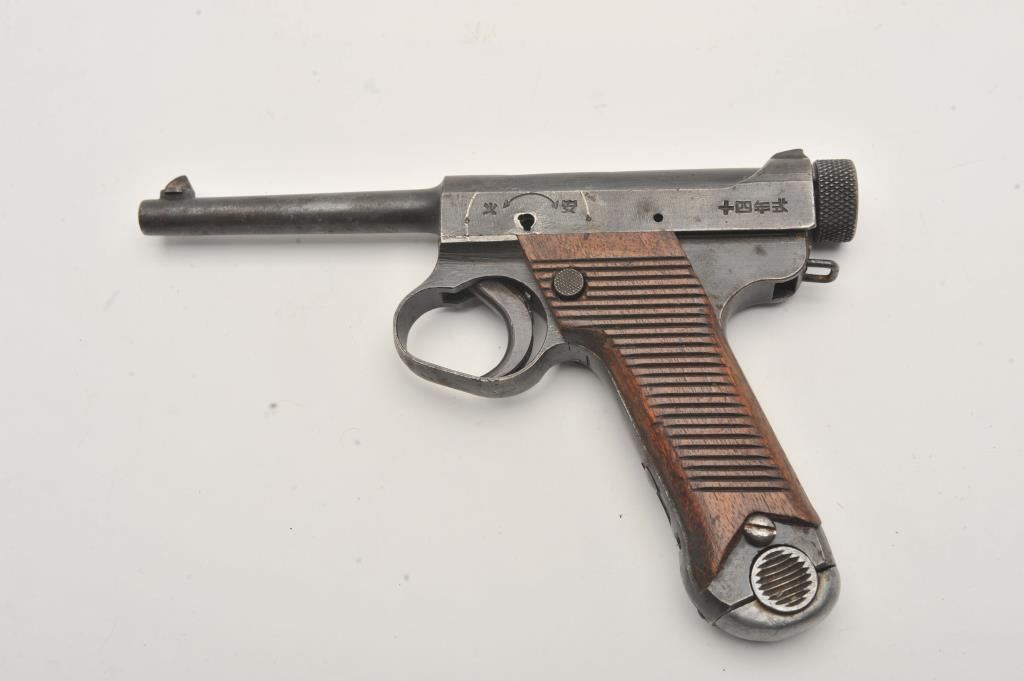 Type 14 Large Guard Nambu semi-automatic pistol, 8mm caliber, Serial #32089. The pistol is in good overall condition with a 5 ½” barrel. The metal surfaces retain a significant amount of their military finish with the remainder going to a grey patina. The pistol is missing the grip scales. The lot includes one correct, matching magazine. The bore is fair, the action functions and the markings are legible. Est.: $125-$250. (C+R).