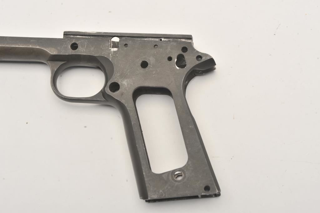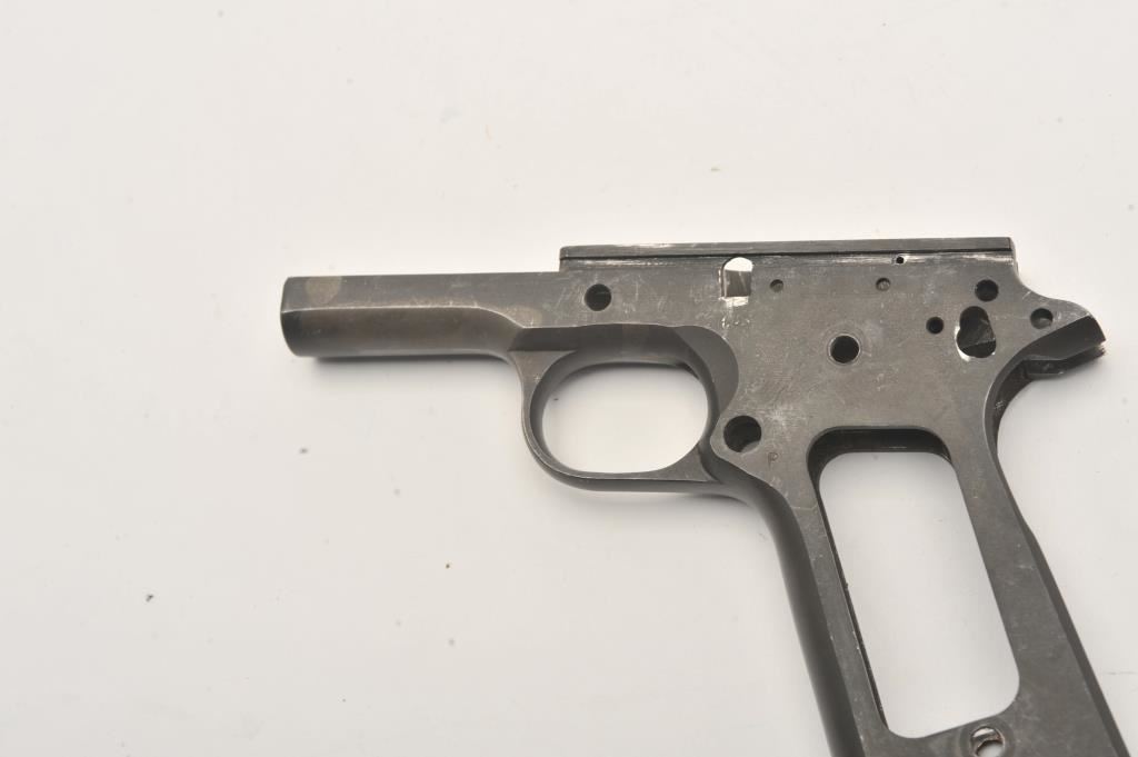 Colt 1911 A1 frame. The frame is in good overall condition Serial #937464. The serial # is written in electric pencil on the right side of the frame. The left side has, “GHD” stamped behind the trigger well. Est.: $100-$200.