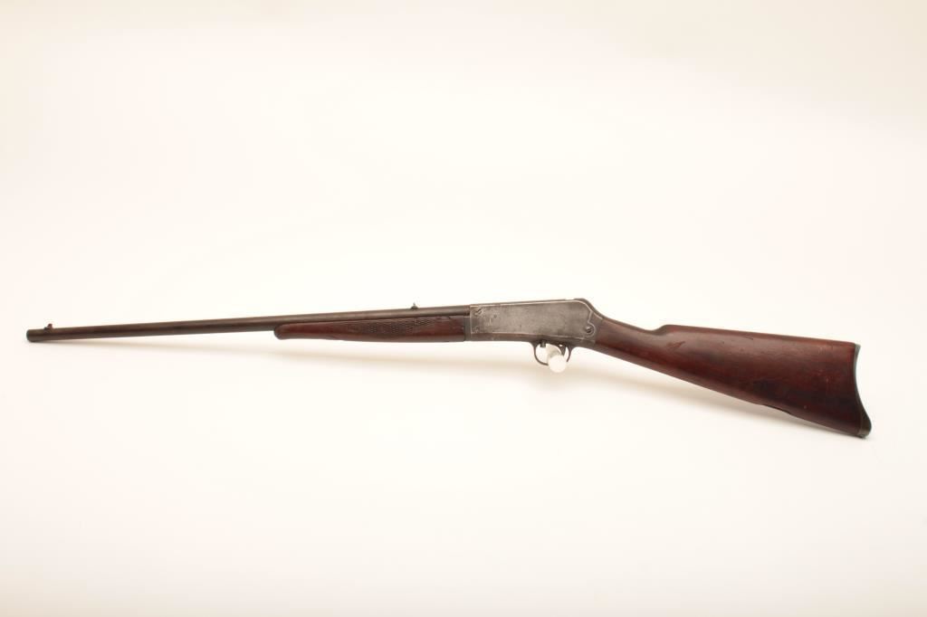 Remington Auto loading semi-automatic rifle, .22 caliber, Serial #NSNV. The rifle is in good overall condition with a 22” barrel. The metal surfaces have gone to a brown/grey patina with areas of light surface erosion on the barrel. The checkered wood stock is in fair condition showing heavy use with mars and compressions. The butt stock ends with a crescent steel butt plate. The bore is fair, the action functions and the markings are legible. Est.: $100-$200. (Modern).