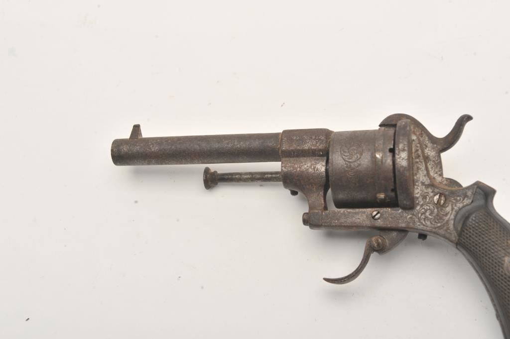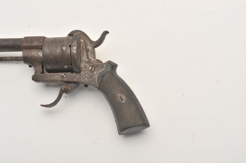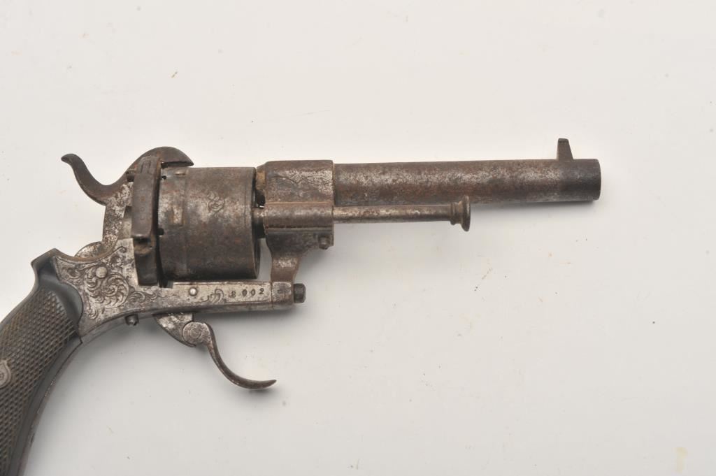 Engraved antique Pinfire revolver, approximately .38 caliber, Serial #8002. The revolver is in fair overall condition with a 4” barrel. The metal surfaces show remnants of the original nickel finish in the protected areas with the majority having gone to a brown patina with light to moderate surface rust. The engraving is well completed with a folding trigger. The checkered Ebony wood grips are in good condition showing small mars and wear. The bore is poor, the action functions and the markings are legible. Est.: $75-$150.