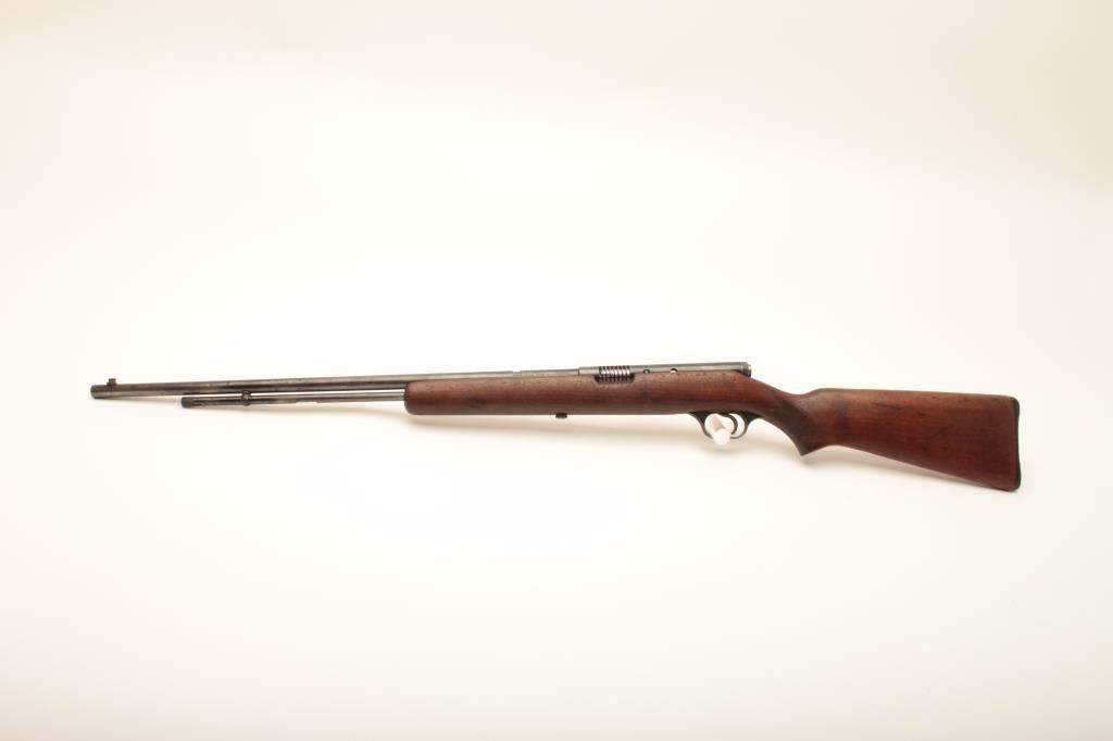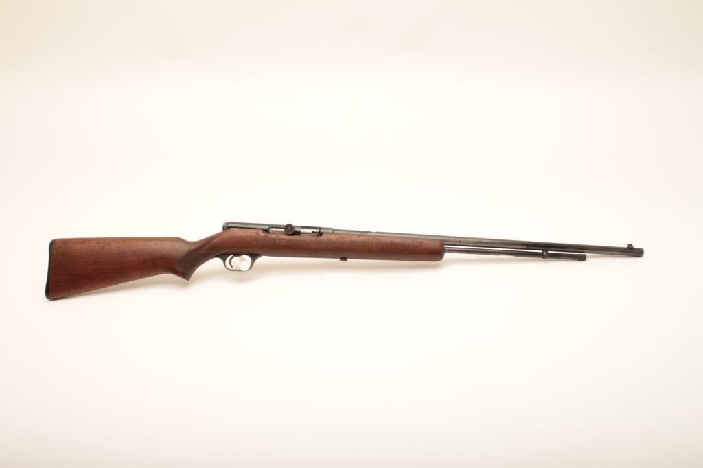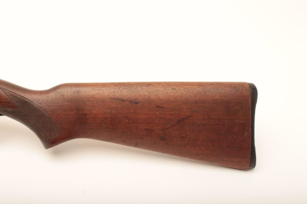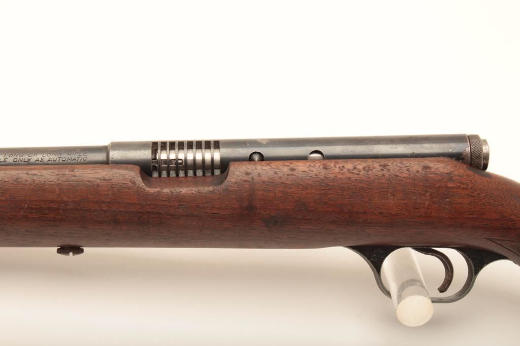 Savage Model 6A semi-automatic rifle, .22 Short, Long or Long Rifle caliber, Serial #NSNV. The rifle is in good overall condition with a 24” barrel with a blade front and rear sight removed. The metal surfaces retain the majority of their thinning blue finish with areas of light surface erosion. The checkered wood stock is in fair condition showing moderate to heavy use with mars, dents and compressions. The bore is fair, the action functions and the markings are legible. Est.: $50-$100. (C+R).