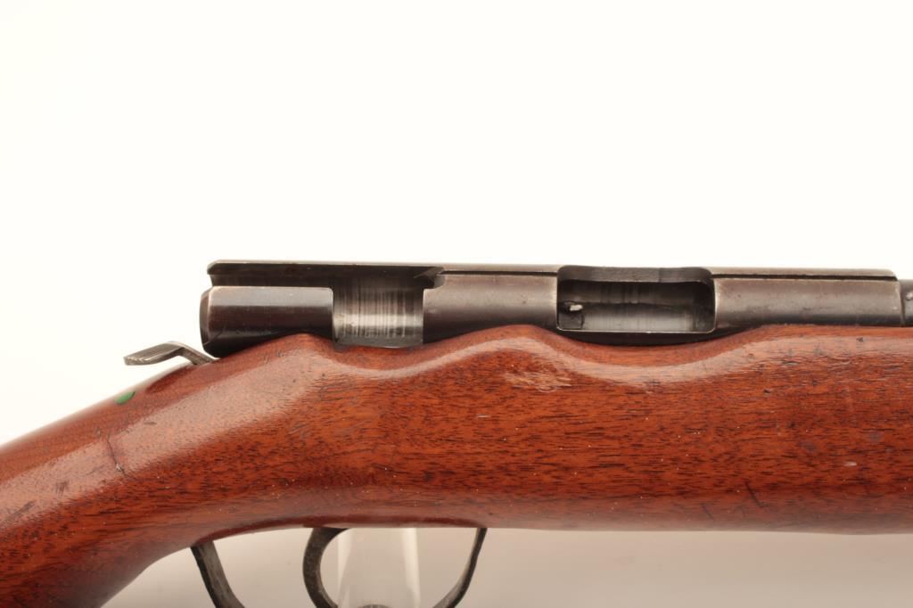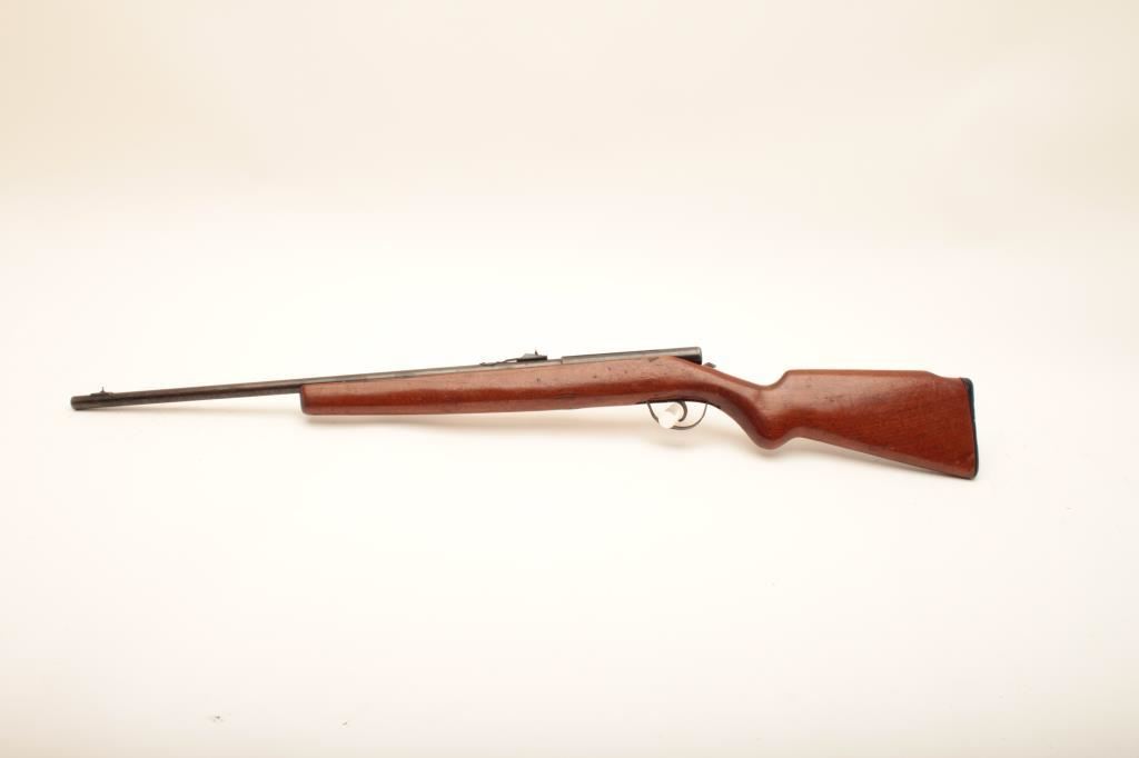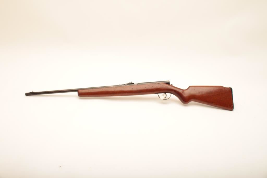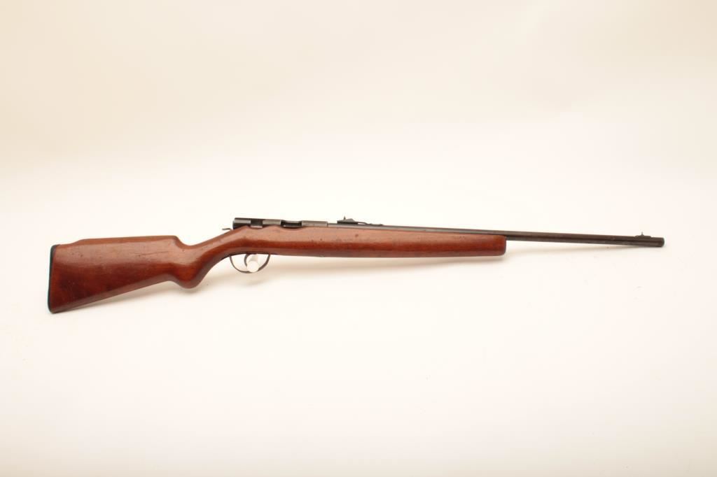 Hawthorne Warrior Model 820B bolt action rifle, .22 caliber, Serial #NSNV. The rifle is in fair overall condition with a 24” barrel. The metal surfaces retain the majority of their blue finish. The action is missing the bolt. The smooth wood stock is in good condition. The bore is fair, the action is missing the bolt and the markings are legible. Est.: $15-$30. (C+R).