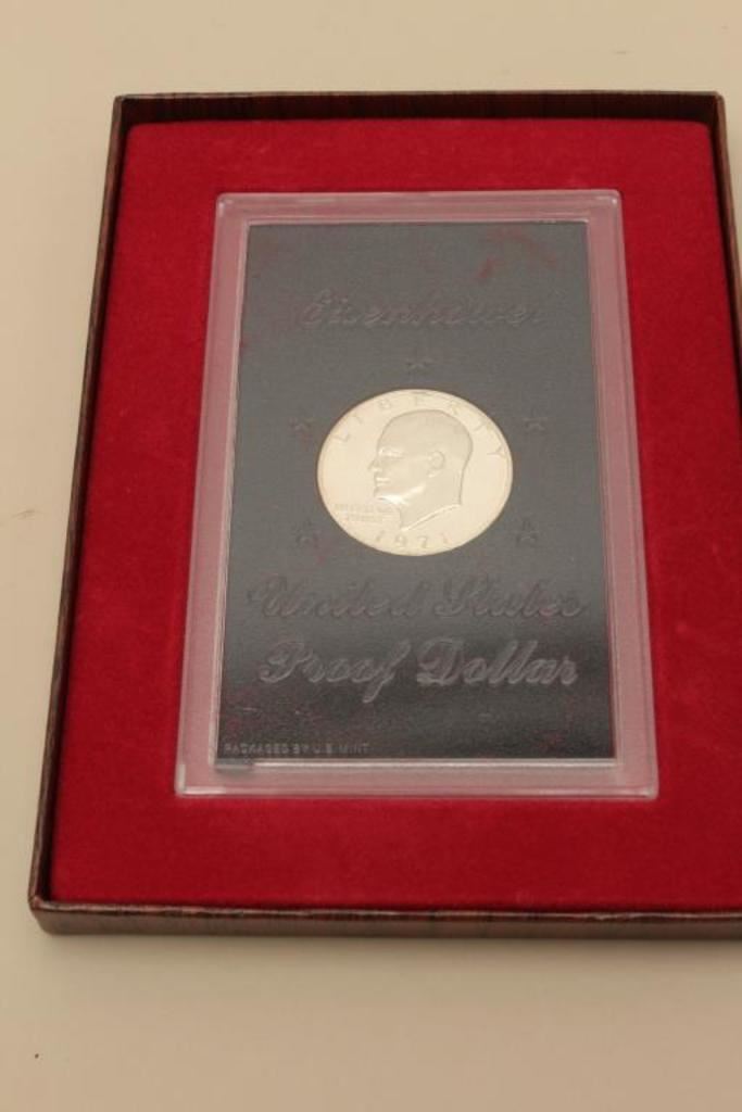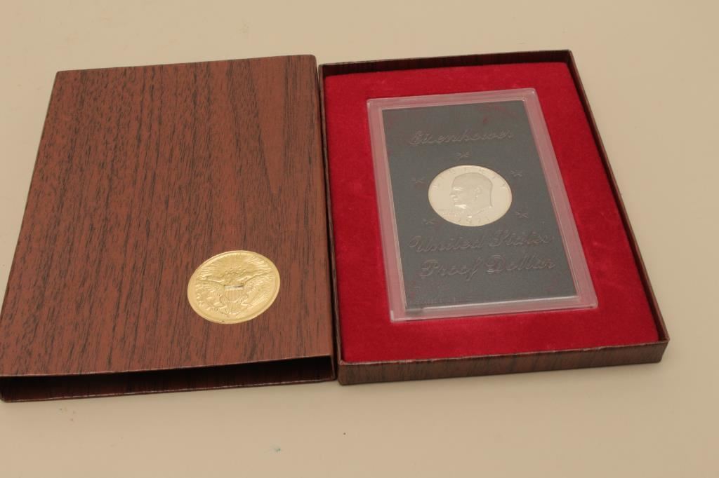 Eisenhower United States Proof Dollar in plastic case marked packaged by U.S. Mint. The plastic case comes in a wood grain cardboard slip case embossed with the American eagle. Est.: $50-$100.