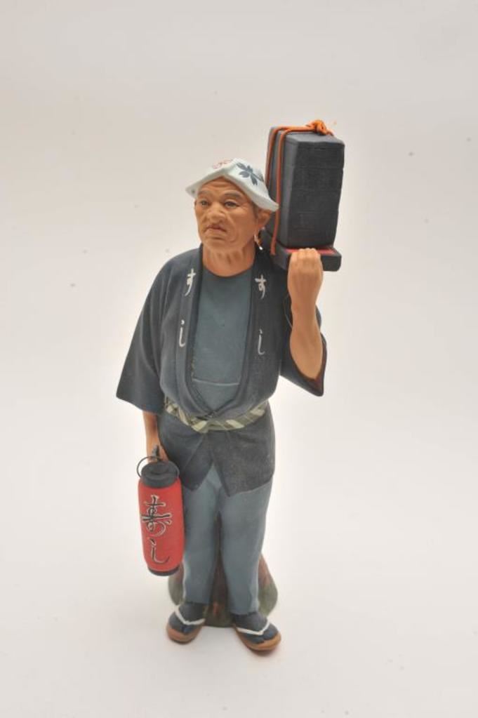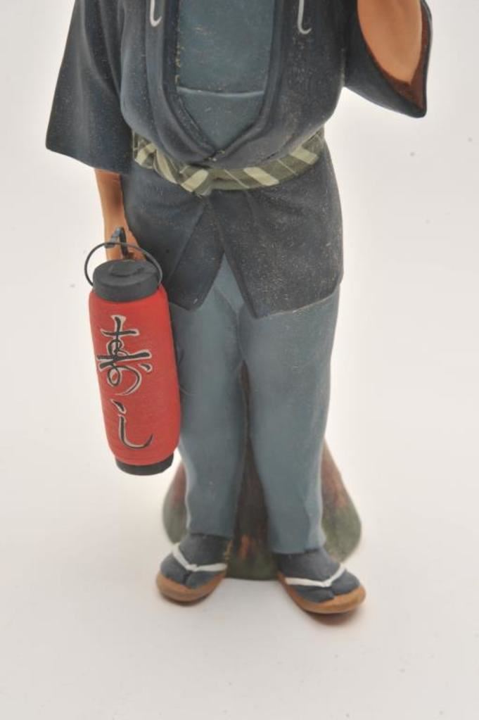 Fine hand painted porcelain of street vendor Hukata. "Vrusaki dolls". Approx. 12" high. Collected by Major Cable on tour of duty in Japan pre 1955-1960's. Est. $75-150
