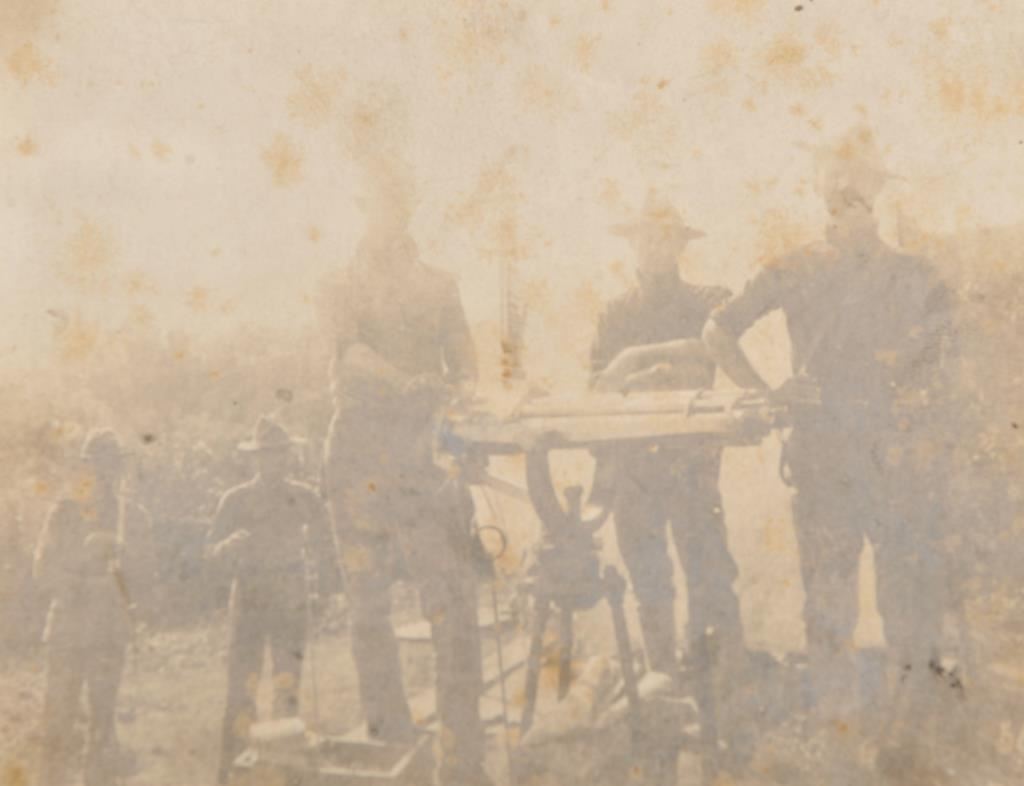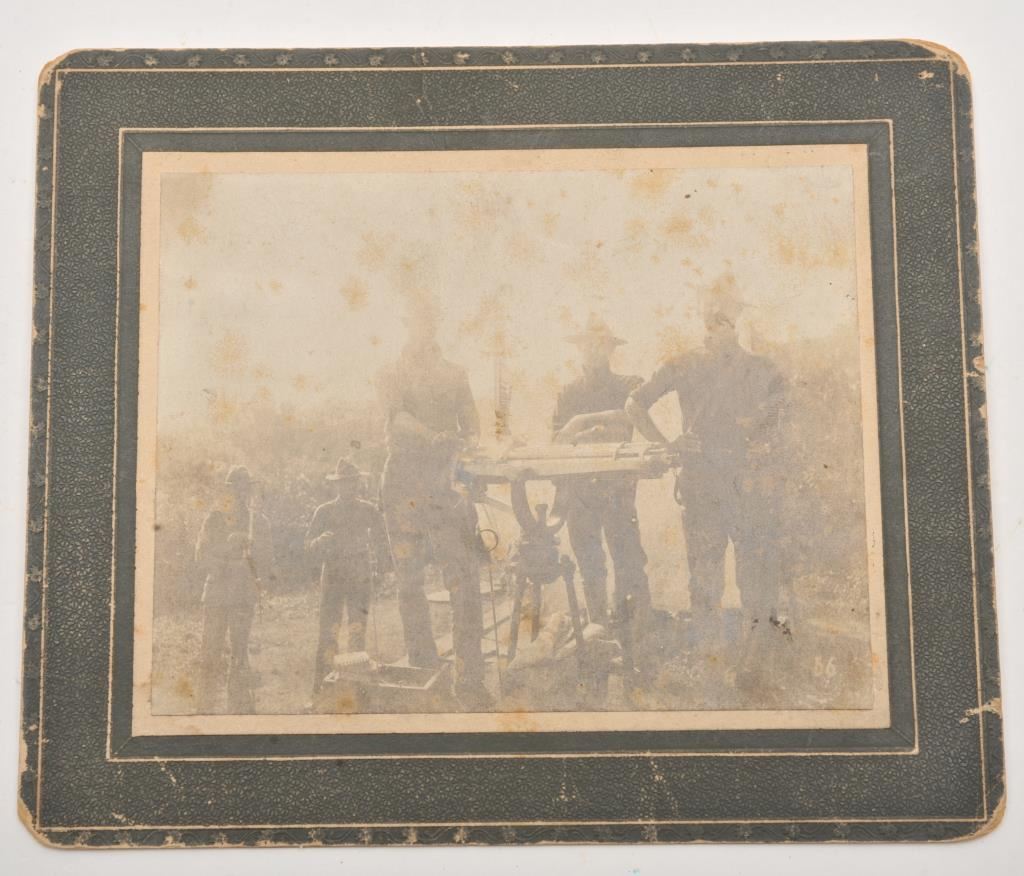 Photo of Spanish American War Troopers with Gatling Gun. Pen inscribed "Rombolong" and Doc James at the gun. 4 3/4" x 3 3/4", fair only, sun burnt image. Est:$100-200