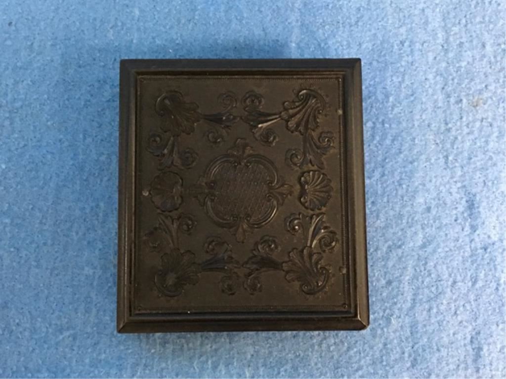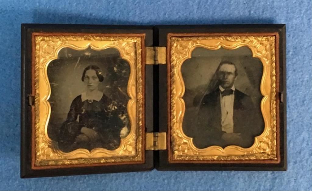 Double Daguerreotype photos in a great Gutta Percha Frame Case. 3 1/2" x 3 3/4". Est:$100-200