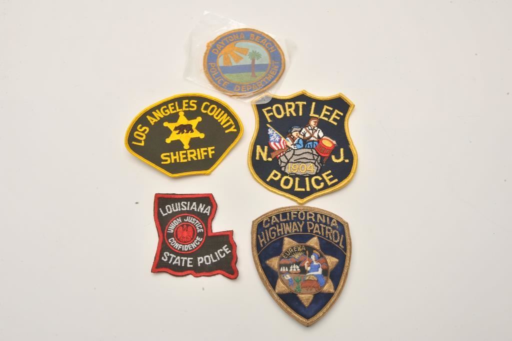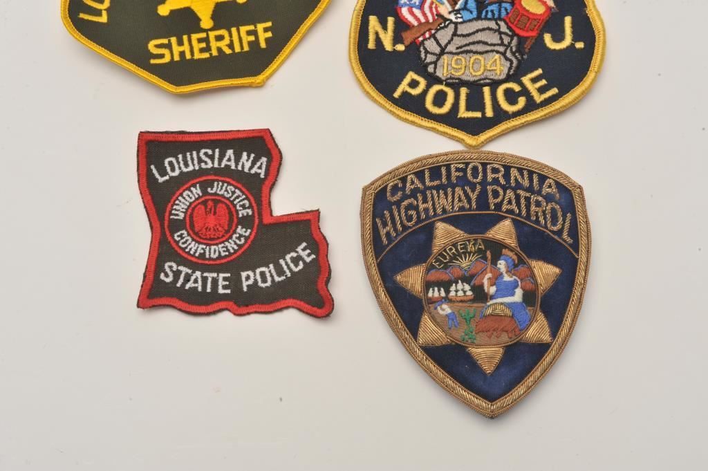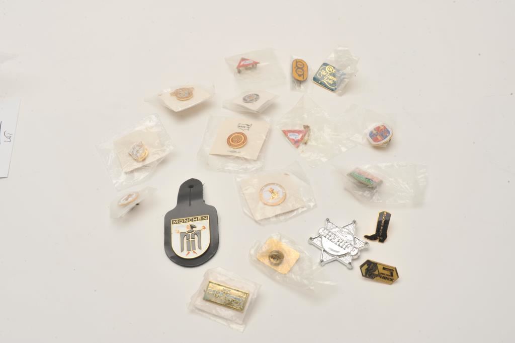 Lot of shooting competition and firearms-related pins and several misc. law enforcement uniform patches. Est.: $50-$100.