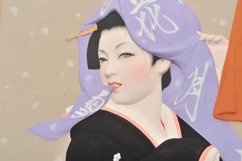 Exquisite Japanese porcelain hand painted wall plaque in it's original box as purchased 1955-1960 in Tokyo by Major John Cable. Signed on wood mounting. Major cable shopped in the finest stores on the "Ginza" in Japan (Great eyes on the lady!) Est. $150-300