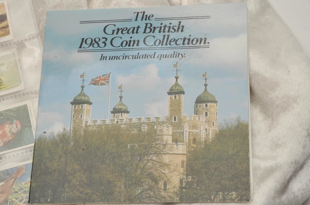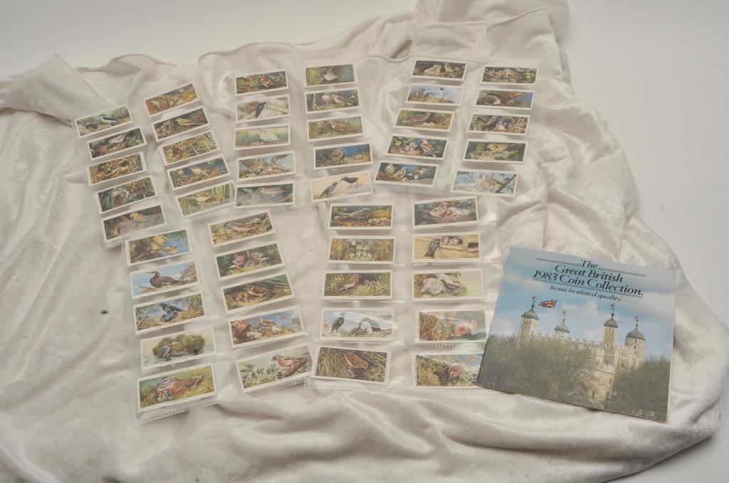 8 uncirculated British coins including a 1 pound coin in a display binder and a collection of players cigarettes cards depicting birds and their youngs. Est:$50-100