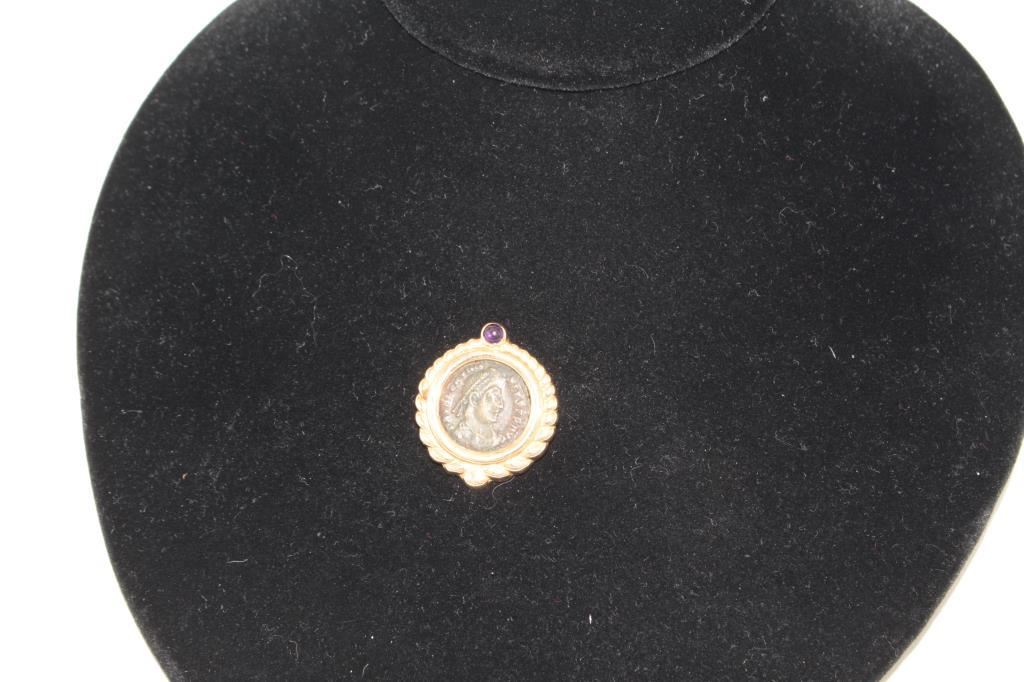 Ancient coin is signed EE 14k bezel with small cabochon amethyst. Est:$175-300