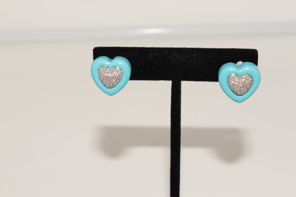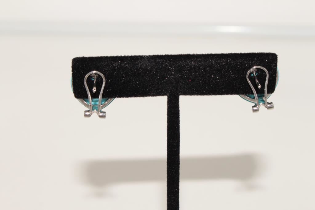 Designer custom Persian turquoise and white gold (clipped and pierced) earrings mounted w/pave diamonds formerly Newport Beach estate purchased Fashion Island in 1980s. Est:$175-300