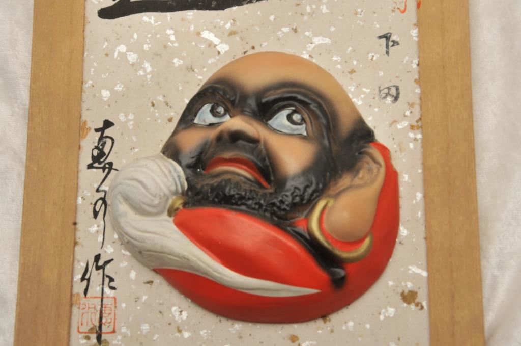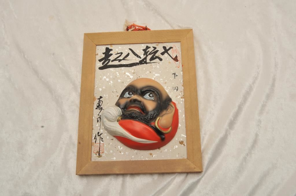 Painted ceramic on plaque of "Doruma". Collected by Major Cable on tour of duty in Japan pre 1955-1960's. In original box. Est. $25-50