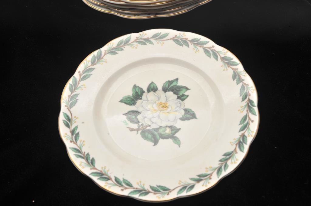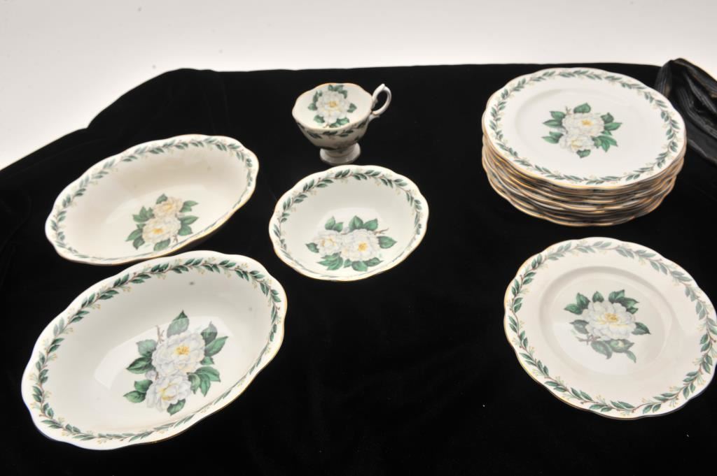 Royal Albert bone china in "Lady Clare" pattern. Collected by Major John Cable 6 - 10 1/4" plates 9 - 8 1/8" plates 8 - 9 1/4" plates 3 - tea cups 20 - 5" saucers for tea cups 1 - 12 7/8" serving platter 2 - 9 1/4" serving bowls 8 - 6 1/4" small plates 1 - soup bowl 1 7 1/4" medium plate "The rest was lost in the blitz, Deary." Collected by Major Cable on tour of duty in Japan pre 1950-1956. Est. $150-300