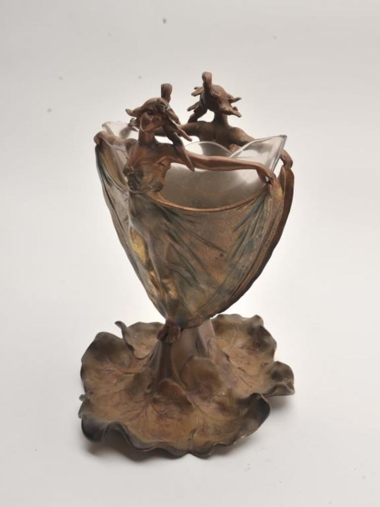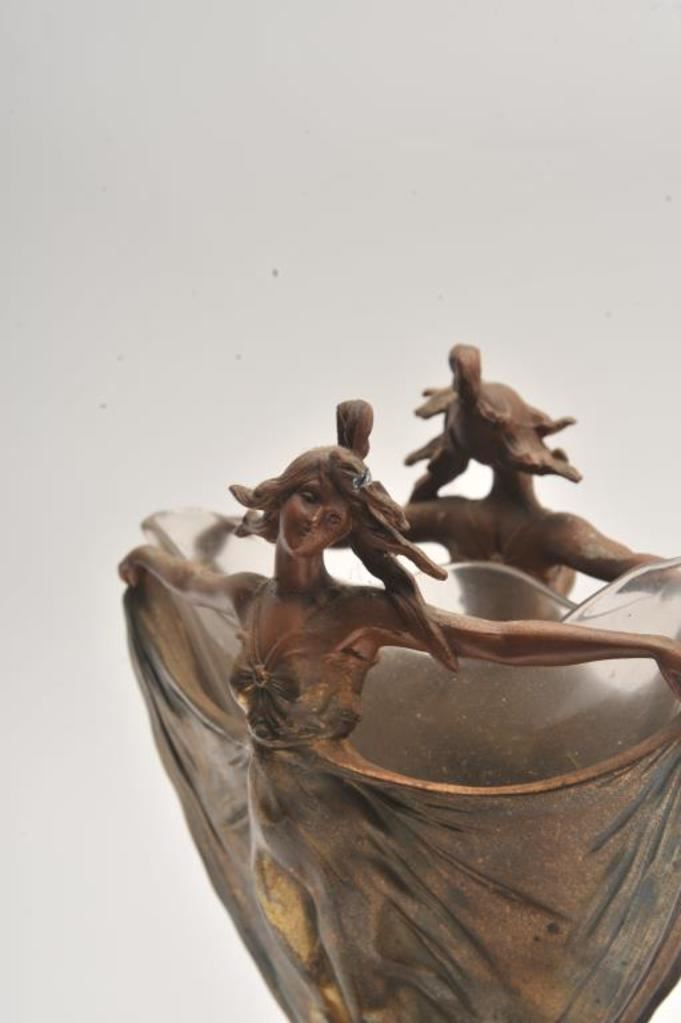 Period art neuveaux vase showing ladies on each side. Original blown glass insert. Art metal with bronze and patinal finish. Found in Argentina 50 years ago. Est. $175-350