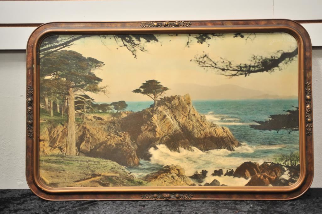 Framed photo of the classic view of cypress tree on the ocean at 17 mile drive in Monterey, CA.; approximately 21” x 33” overall. Est.: $100-$150.