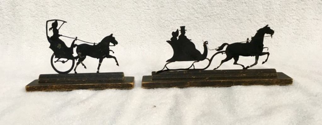 Two small Folk rt Silhouettes hand cut out of metal. A horse drawn sleigh and a Two Wheel Chaise. Est:$100-200
