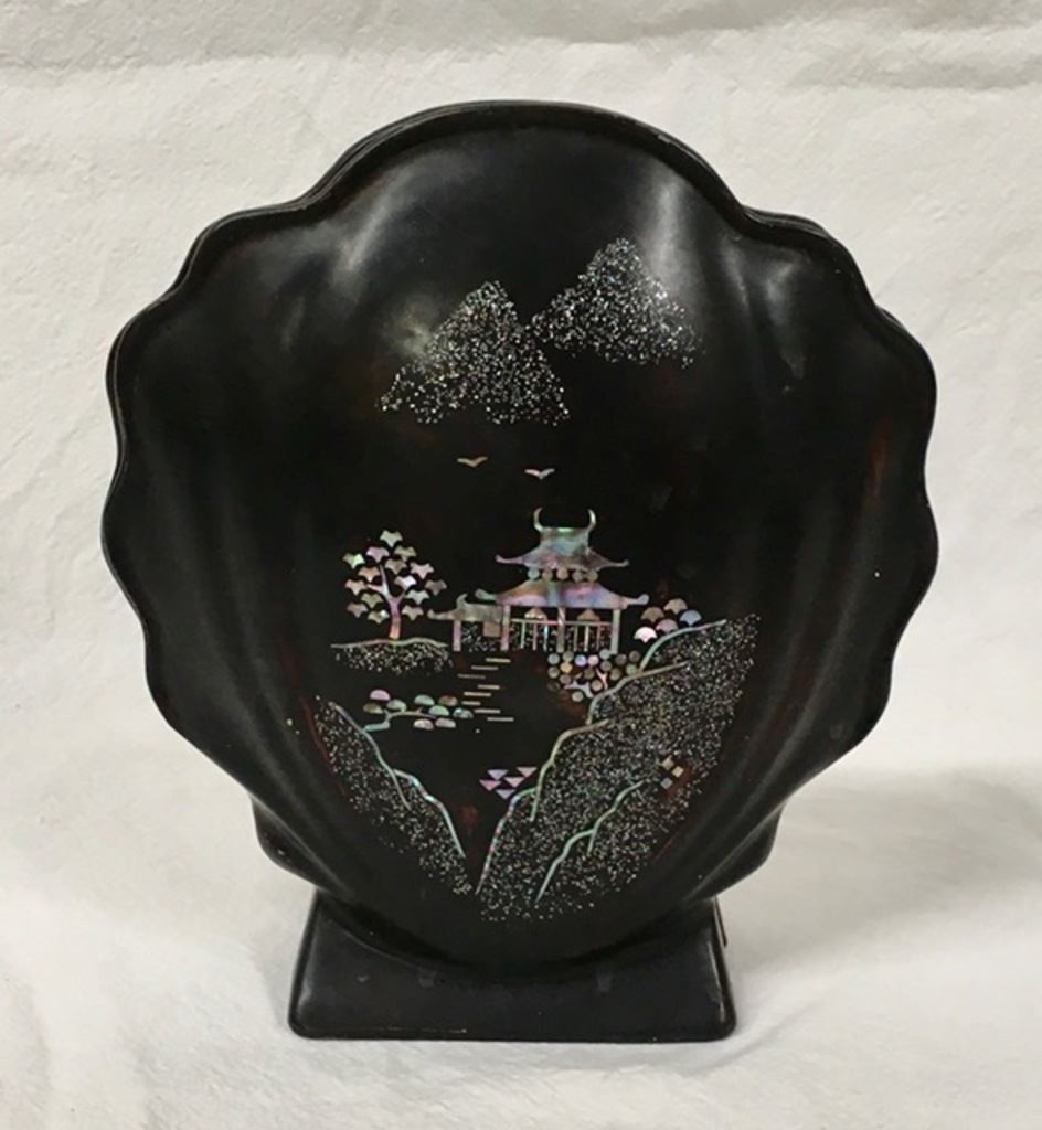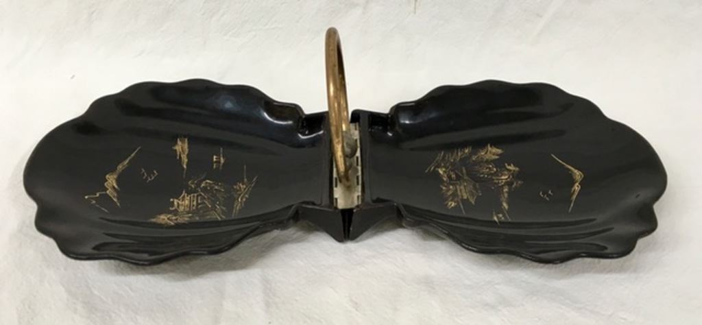 Oriental Lacquered folding metal Hors d’oeuver serving tray inlaid with mother of pearl. Open #17”. Closed 8 1/4” TallEstimate $100-$200