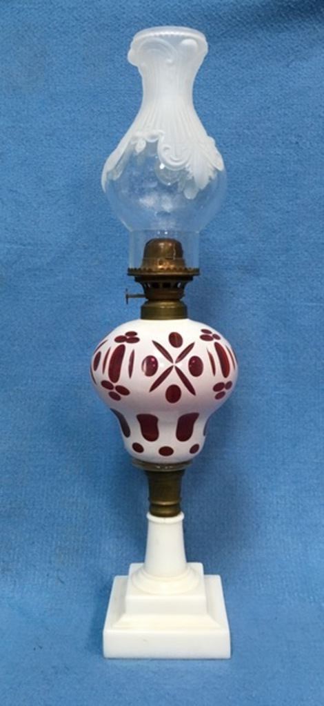 Victorian white cut to ruby overlay glass oil lamp attributed to Boston & Sandwich Glass Co. Circa 1880s. 23" tall including chimney. Est.:$200-$400.