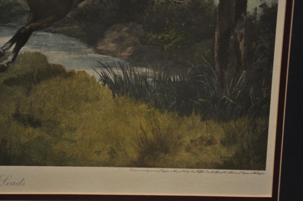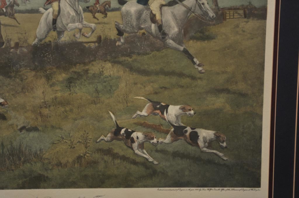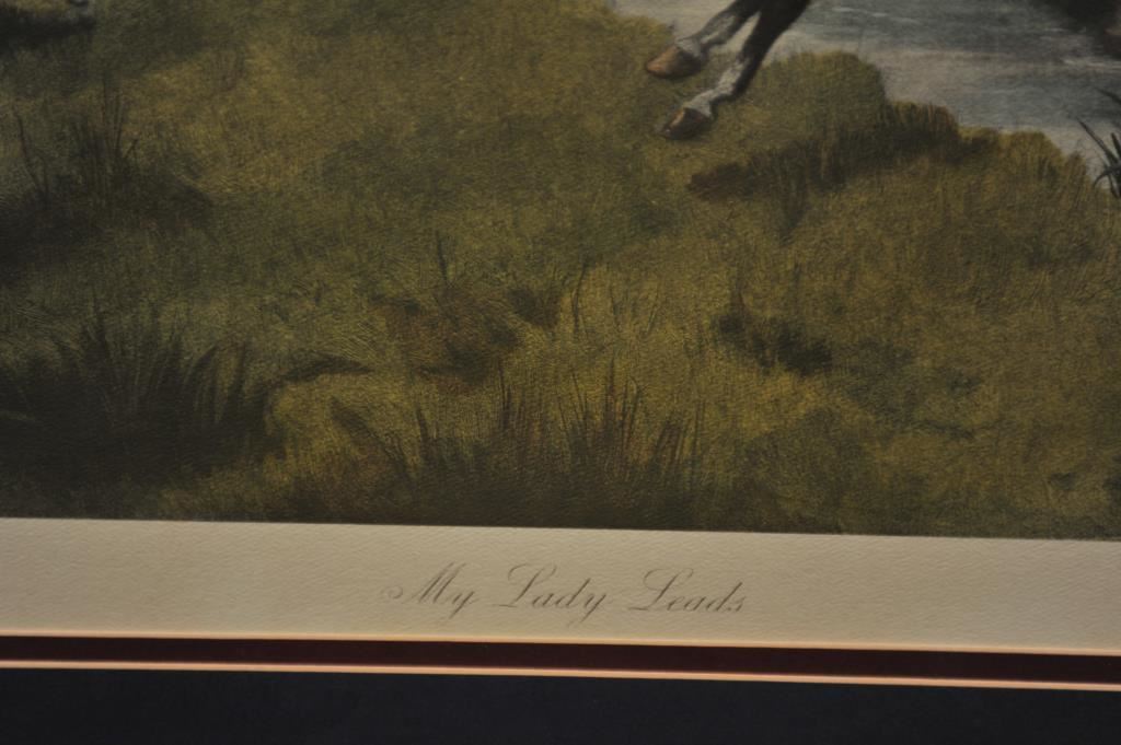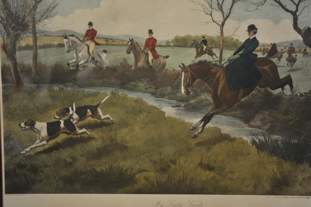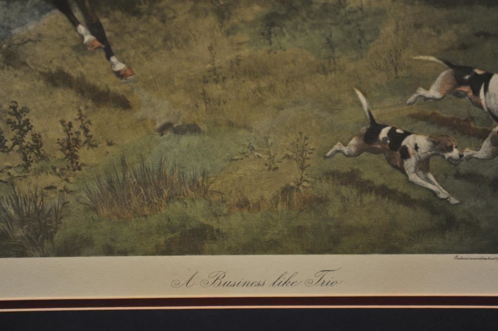 Pair of fox hunting prints framed en suite (Matching) titled “My Lady Leads” and “A Business Trio” printed by G.D. Rowlandson. “Emtered as act of congress 1900”. Excellent condition. Over $650 to frame and matted 25 years ago. Both measure 15 ¼” x 23 ¼”. Est.: $300-$600