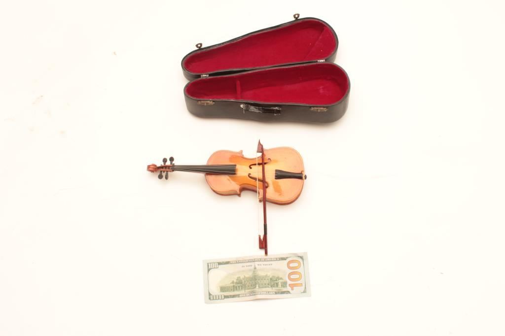 Miniature varnished wood Music Box in form of violin with case containing miniature bow. 10" from tip to end. Plays well. Est:$250-500