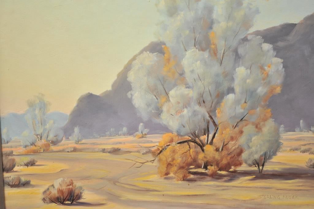 Framed oil on board of desert scene by listed artist Sterling Moak; approximately 22” x 27” overall; nicely accomplished. Est.: $200-$400.