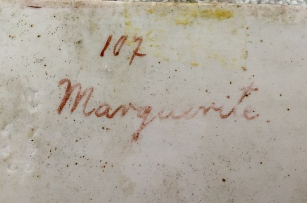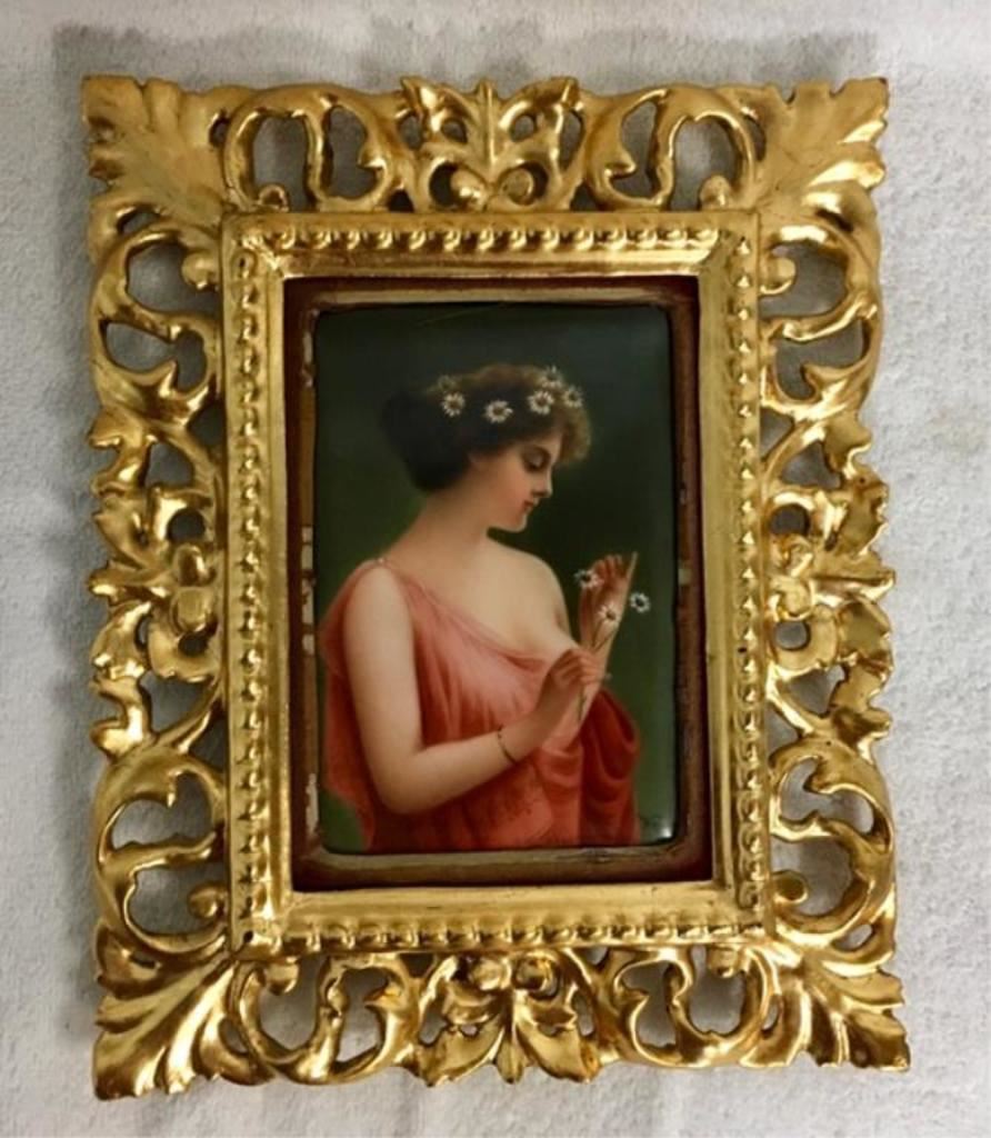 Hand painted porcelain plaque of Marquenite in carved gold gilded frame. Signed Wagner. Frame is 10 1/4" x 8 1/4", Plaque is 5 3/5" x 4". Est:$400-800